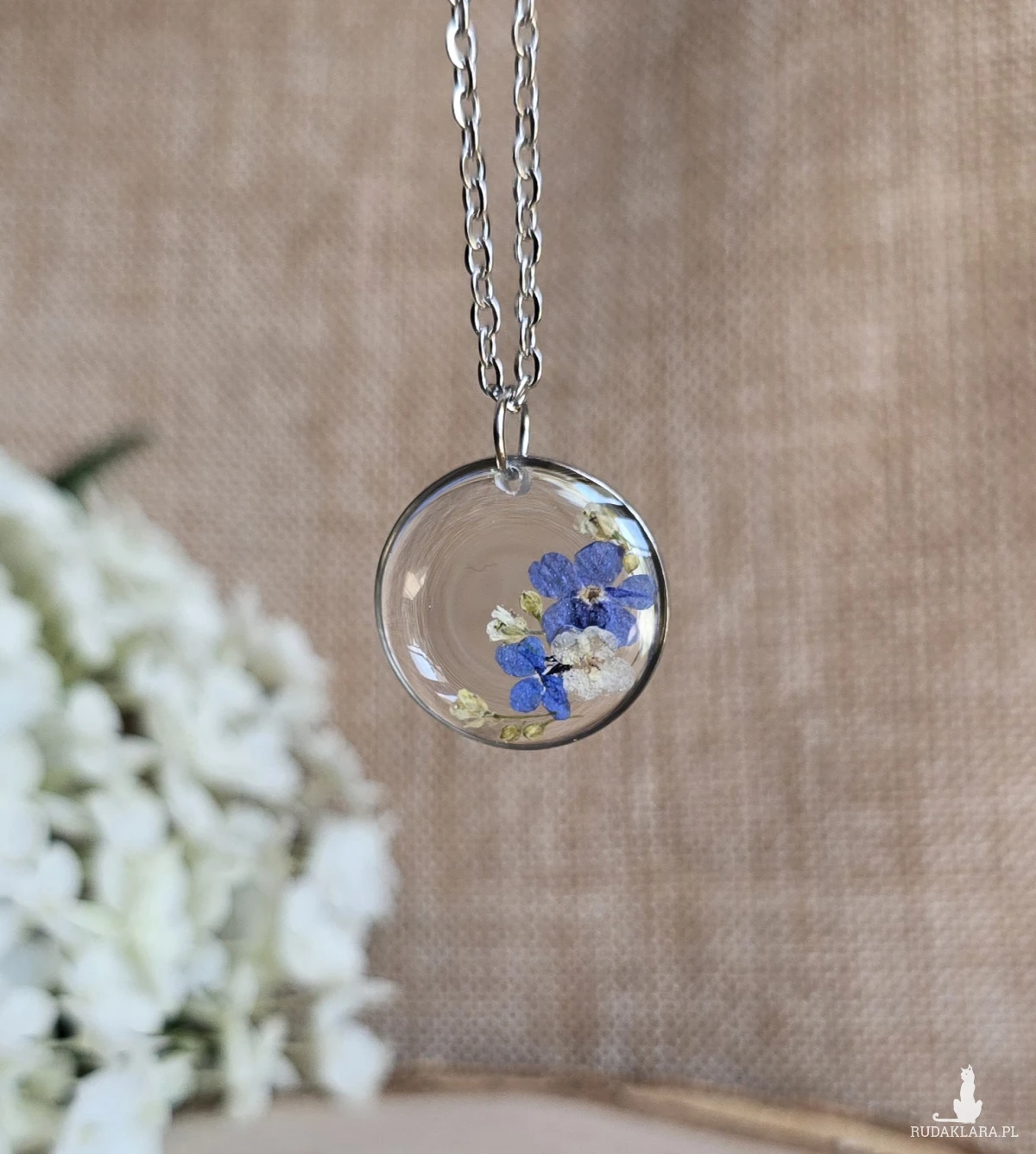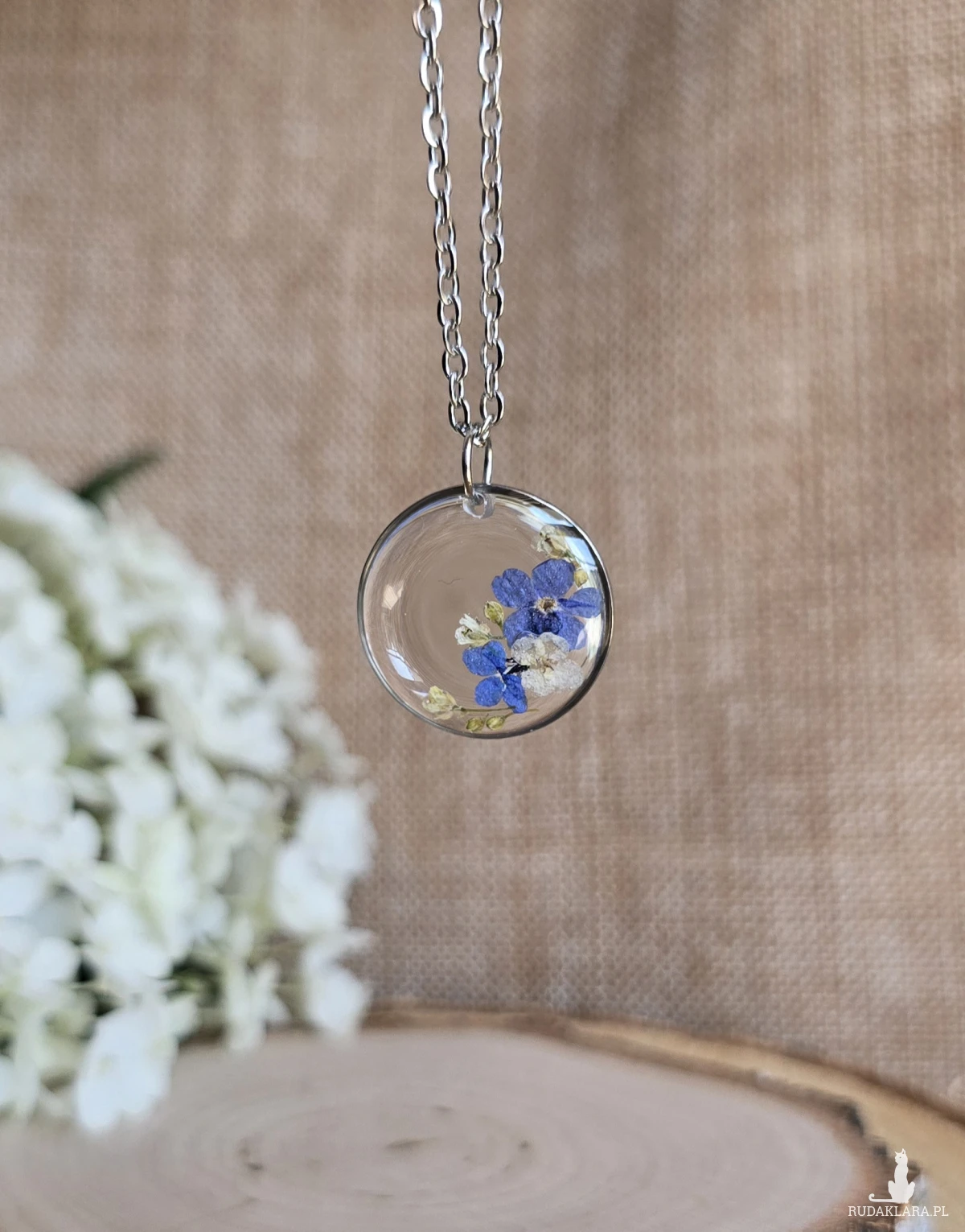 Oferuję Państwu unikalną biżuterię. Zawieszka jest wykonana z suszonych kwiatów i żywicy epoksydowej. Biżuteria jest wspaniałym i oryginalnym prezentem na lata.