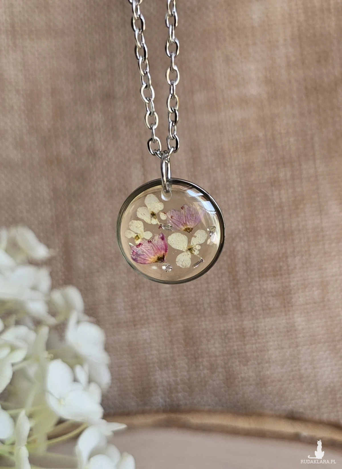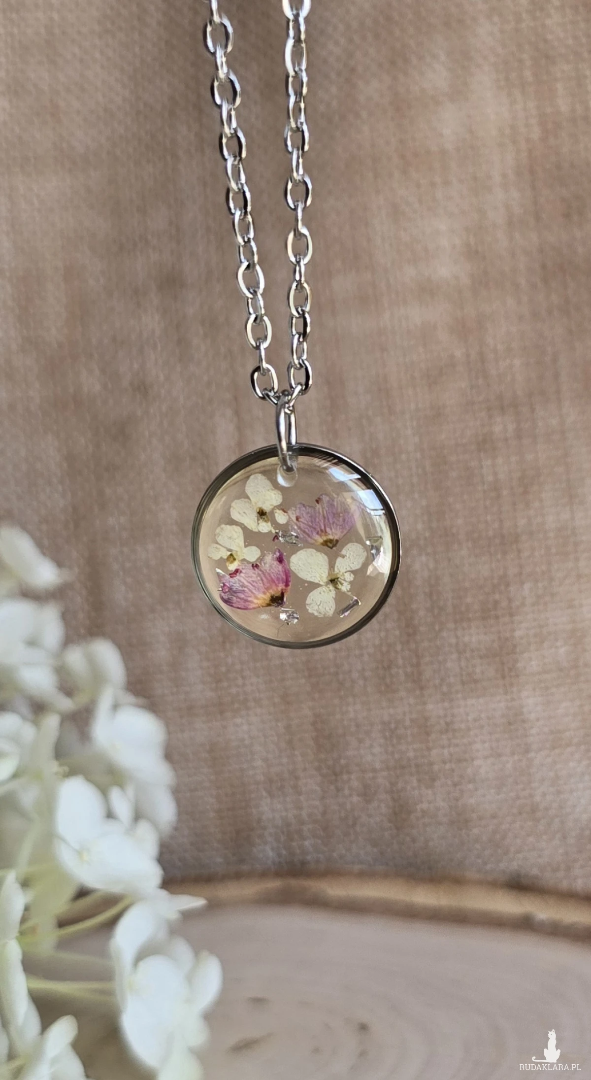 Oferuję Państwu unikalną biżuterię. Zawieszka jest wykonana z suszonych kwiatów i żywicy epoksydowej. Biżuteria jest wspaniałym i oryginalnym prezentem na lata.