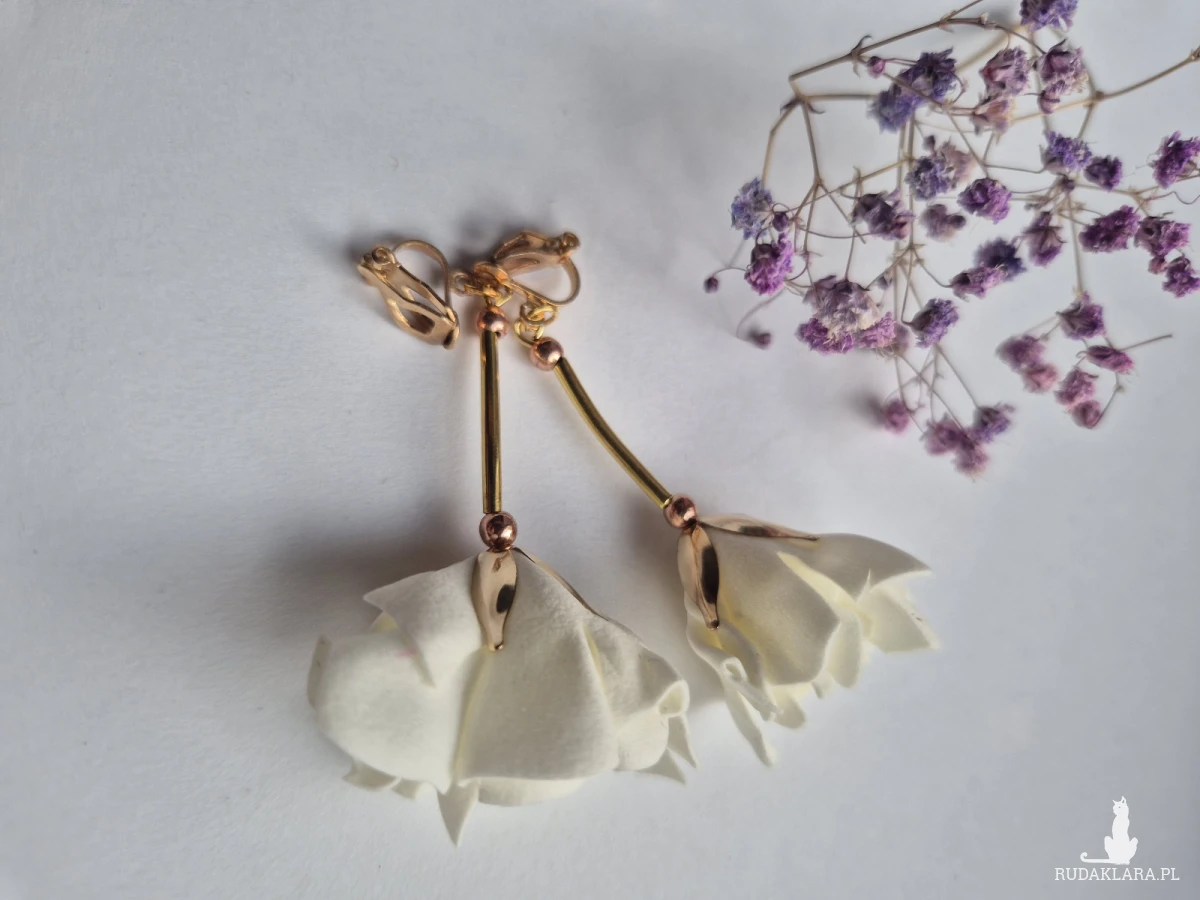 Klipsy białe kwiaty mogą uchodzić za klipsy ślubne ,lekkie robione ręcznie, Jeśli wolisz kolczyki napisz polecam
