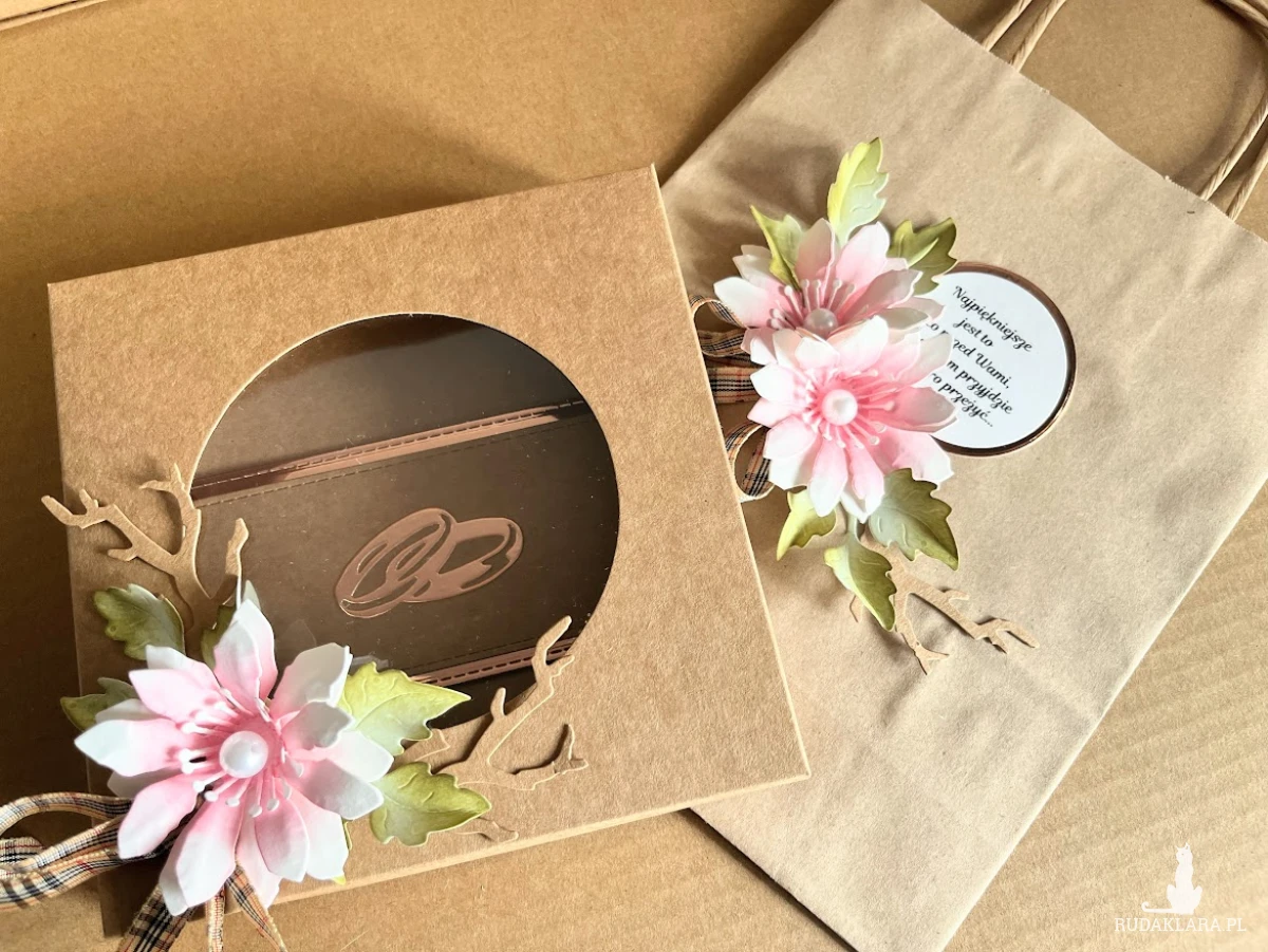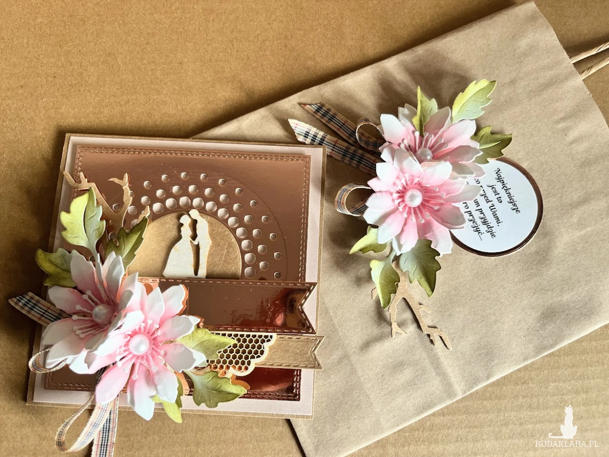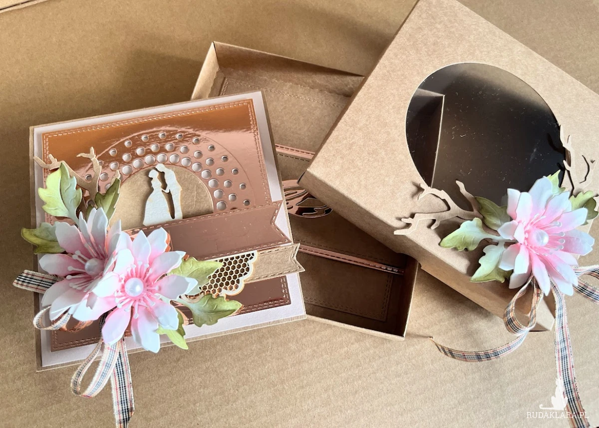 Kartka z okazji Ślubu wykonana ręcznie z niezwykłą starannością i dbałością o każdy detal. Na bazie z papieru kraftowego, w naturalnej brązowej kolorystyce z dodatkiem lustrzanego rożowego złota, z elegancką kwiatową kompozycją wraz z pudełkiem z okienkiem ozdobionym w tej samej stylizacji. Do kompletu dołączono torebkę w tej samej stylizacji.Wielkość torebki 18x23cm x 8cm. Rozmiar kartki 14,0 x 14,0 cm. Wewnątrz kartki znajdują się gotowe życzenia do własnoręcznego podpisu a na dnie pudełka kieszonka na małe co nieco.Pudełko z papieru kraftowego -rozmiar 15,5 x 15,5 cm .W tej postaci komplet dostępny od ręki. Jest możliwość personalizacji w uwagach do zamówienia podać imiona i datę ślubu oraz imiona skladających życzenia.