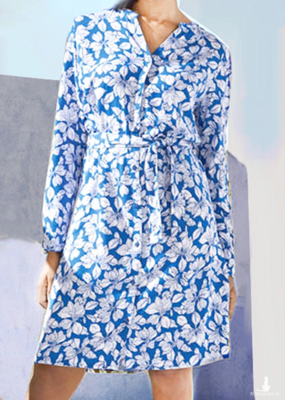 Nowa, przewiewna sukienka rozmiar 40. Sukienka jest zapinana na guziczki, długi rękaw. Wzór w kwiatki, kolory biały i niebieski (granatowy). Materiał: wiskoza 100%,, marka esmara. Ubranie można nosić także jako tunikę. Sukienka posiada pasek. Uniwersalny, lekki strój damski zarówno na różne okazje, jak i na co dzień. Wymiary: