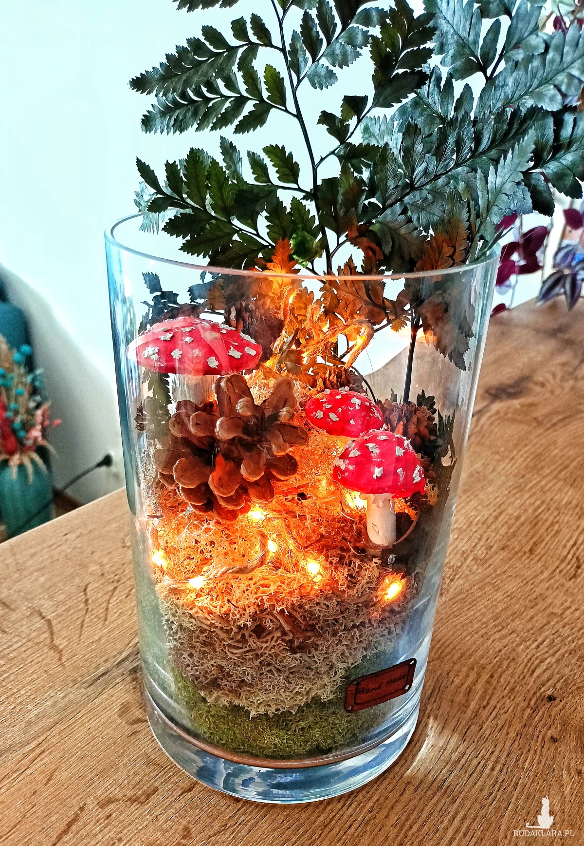 Wprowadź do swojego wnętrza odrobinę magii lasu dzięki tej ręcznie wykonanej kompozycji, która łączy naturalne piękno suszonych i stabilizowanych roślin z nastrojowym światłem imitującym świetliki.