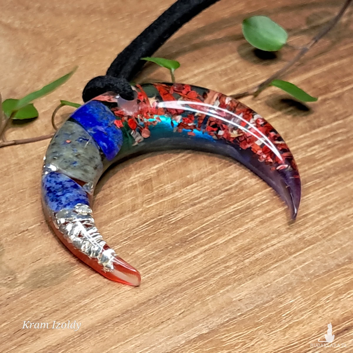 Lunula czakralna, orgonit - wisior z żywicy, lapis lazuli i smagliczka