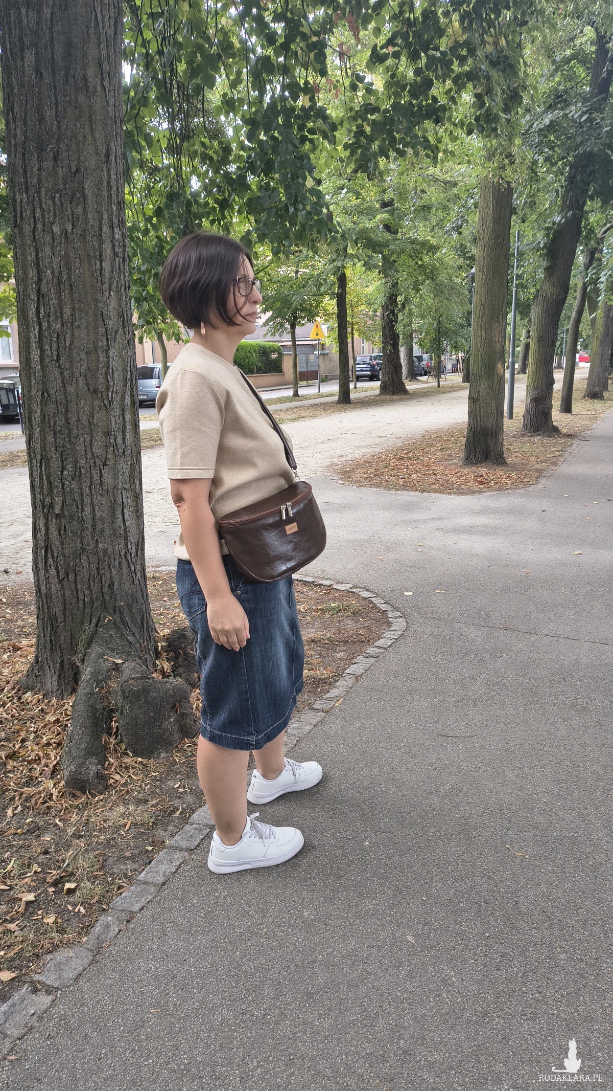Jest to bardzo wygodna torebka, którą możemy nosić tradycyjnie na długim pasku lub na krótszym ze skosa, jak nerkę. Dzięki szerokiemu dnu jest dużo bardziej pojemna od tradycyjnej nerki. Wersja klasyczna. Do jej wykonania użyłam ekoskóry w kolorze czekolady. Jest ona odrobinę błyszcząca. Będzie pasować do stylu casual jak i do bardziej eleganckich stylizacji