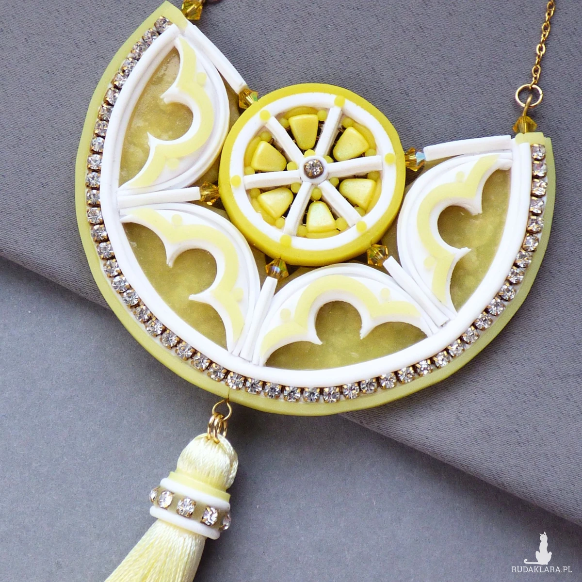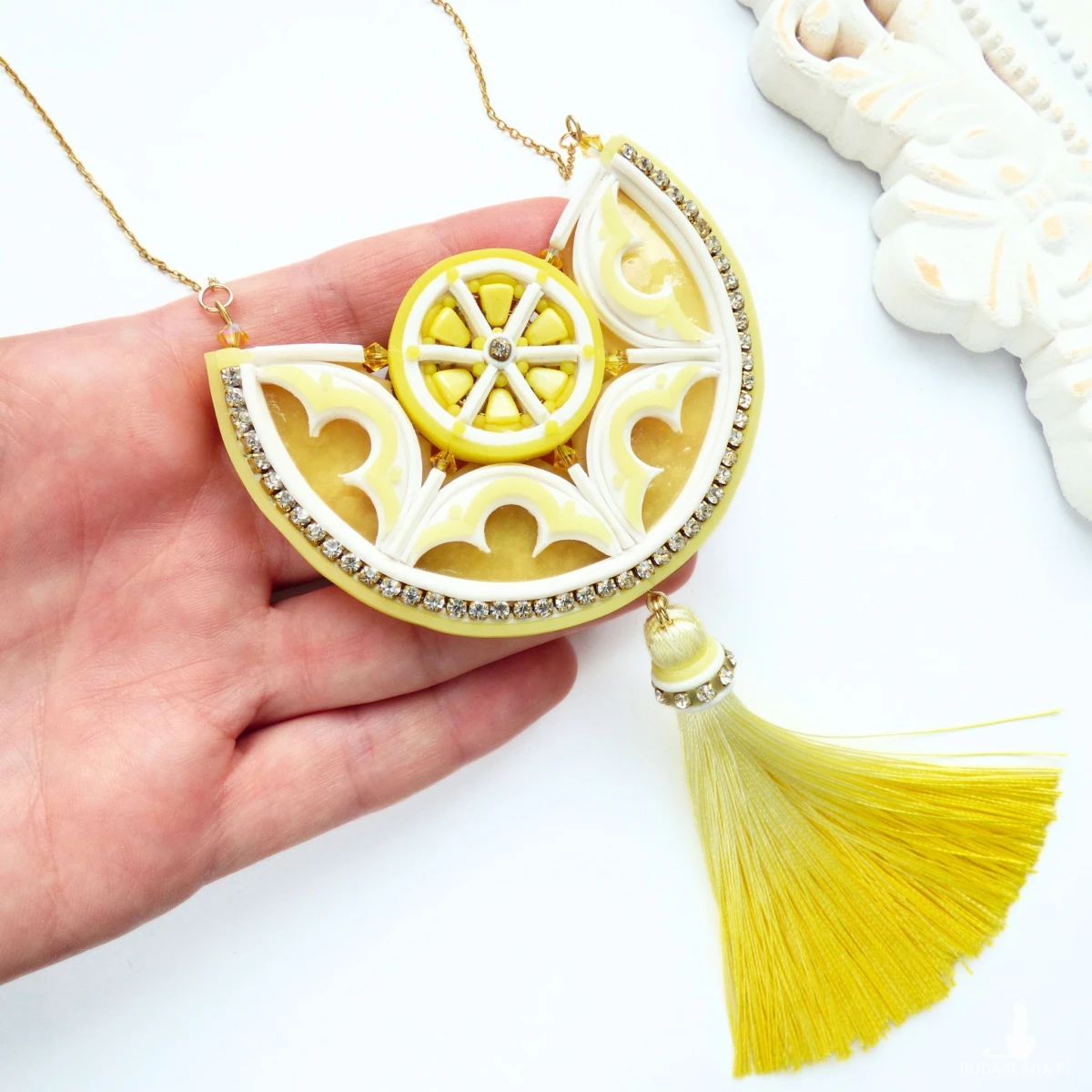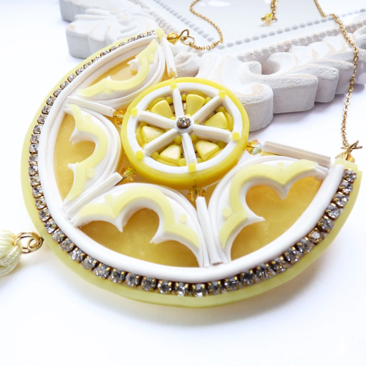 Naszyjnik inspirowany owocem cytryny i geometrią jej plasterka. Jest jak lemoniada w gotyckim kształcie, pełna słonecznego blasku... Przypomina fragment witraża wypełniony cytrynowym sokiem w miejsce szkła i plasterkiem cytryny w roli centralnej rozety. Otoczony lśniącymi kryształkami, niczym światło przenikające przez witraże. Całość dopełnia jedwabisty chwost w cytrynowym odcieniu – miękki, zmysłowy akcent, który porusza się z każdym krokiem, przyciągając wzrok subtelnym ruchem.