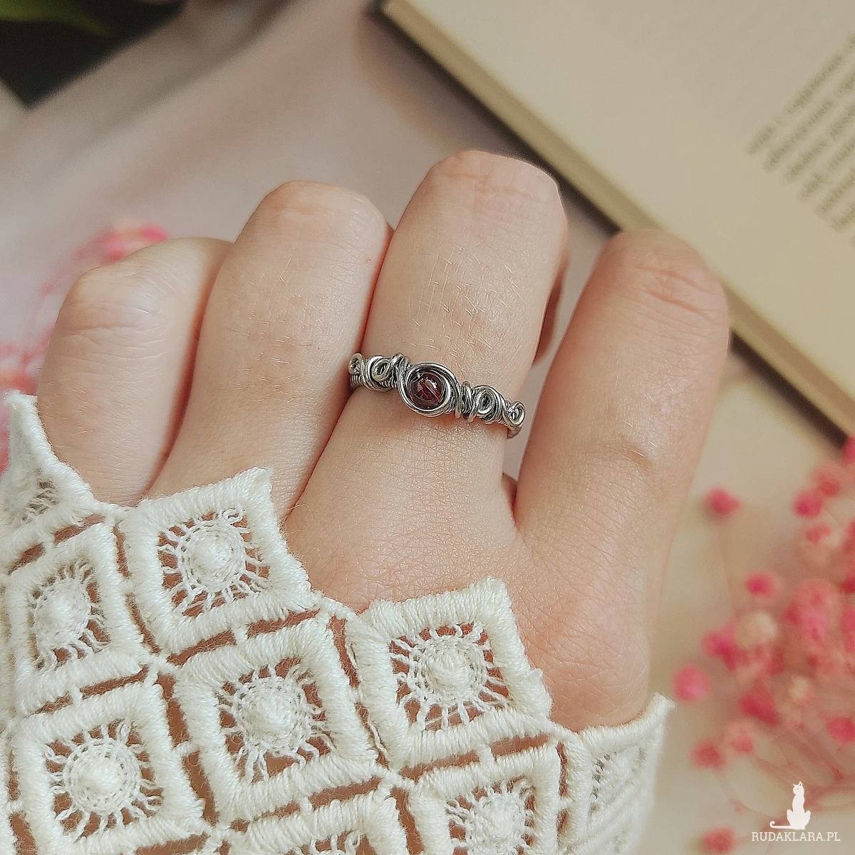 Pierścionek Granat ręcznie robiony. Wykonany techniką wire wrapping z drutów ze stali chirurgicznej.