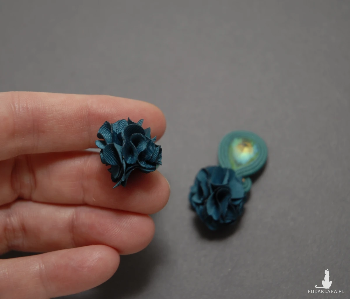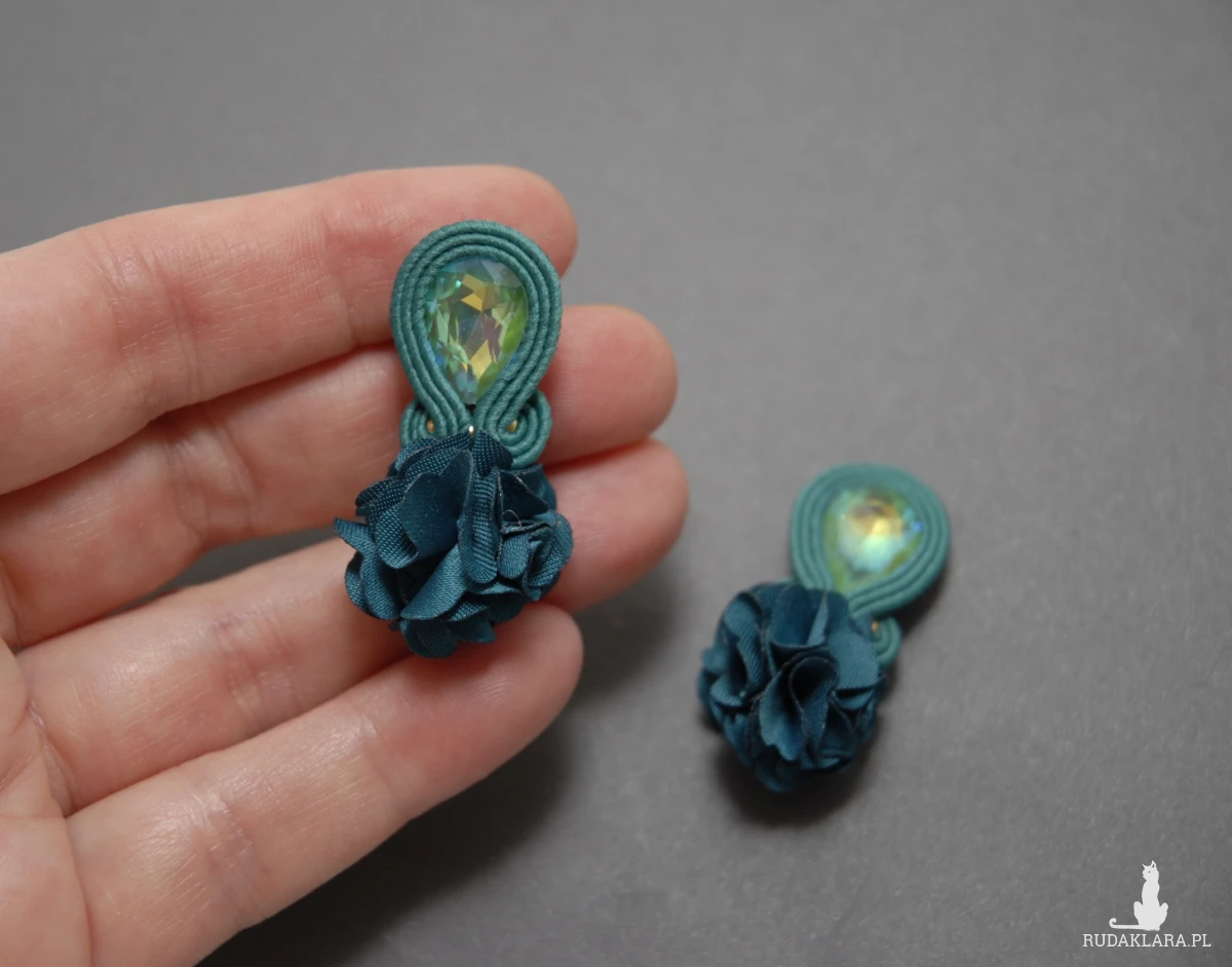 oferuję kolczyki (sztyfty) lub klipsy zrobione techniką sutasz, ozdobione fasetowanymi szklanymi kaboszonami i kwiatkami z materiału