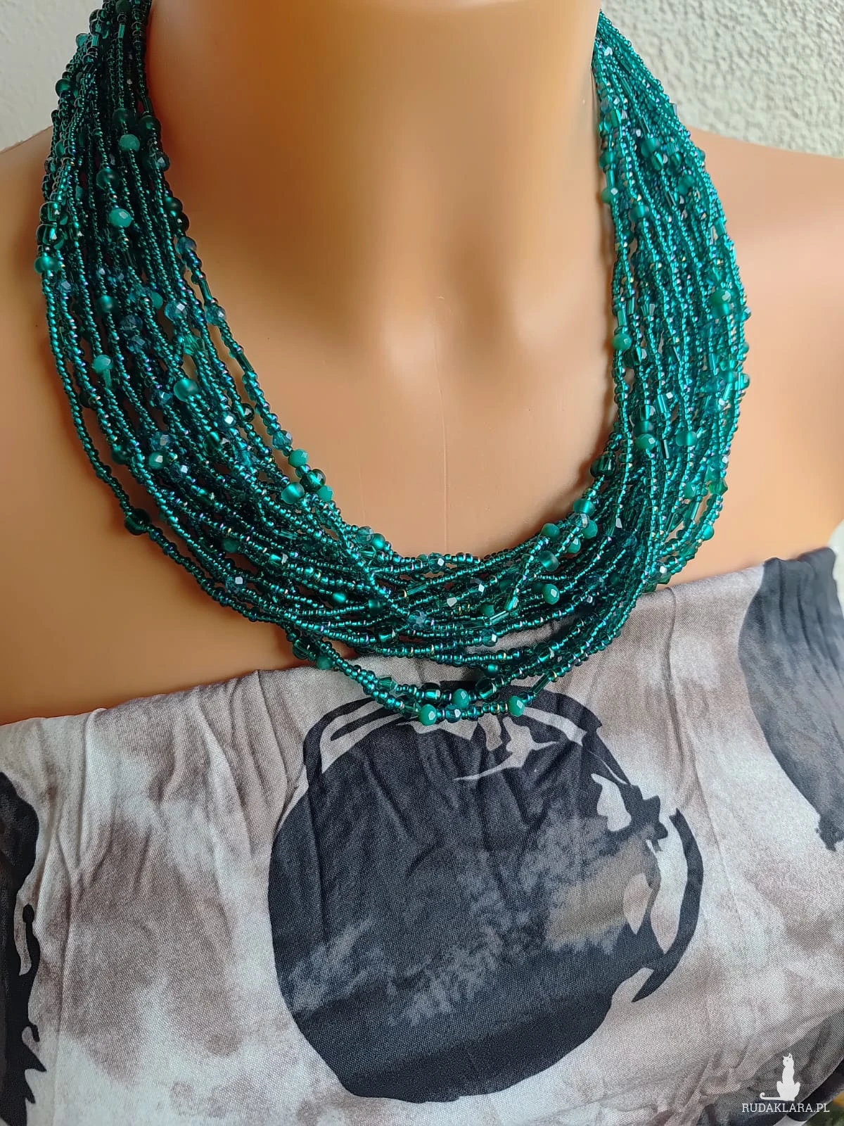 Naszyjnik w kolorze pięknej zieleni, kryształki szklane oponki szlifowane i inne koraliki szklane rurki i kuleczki 2 mm, Wykończenie w kolorze zlotym, filigranowe czapeczki i zapięcie ze stali nierdzewnej. Objętość 48 cm