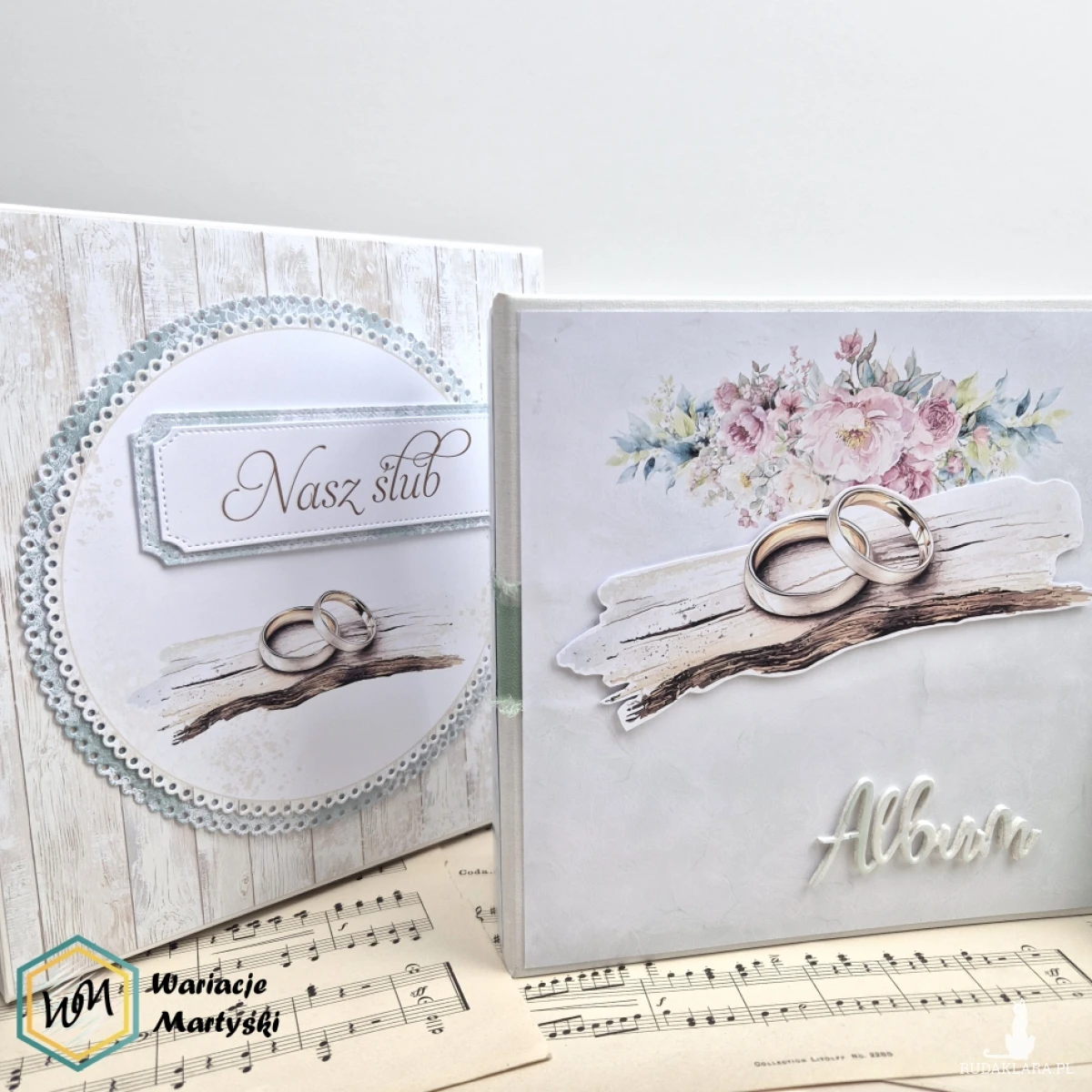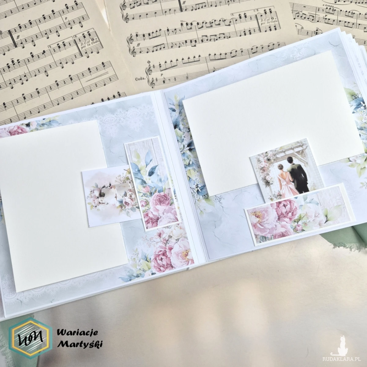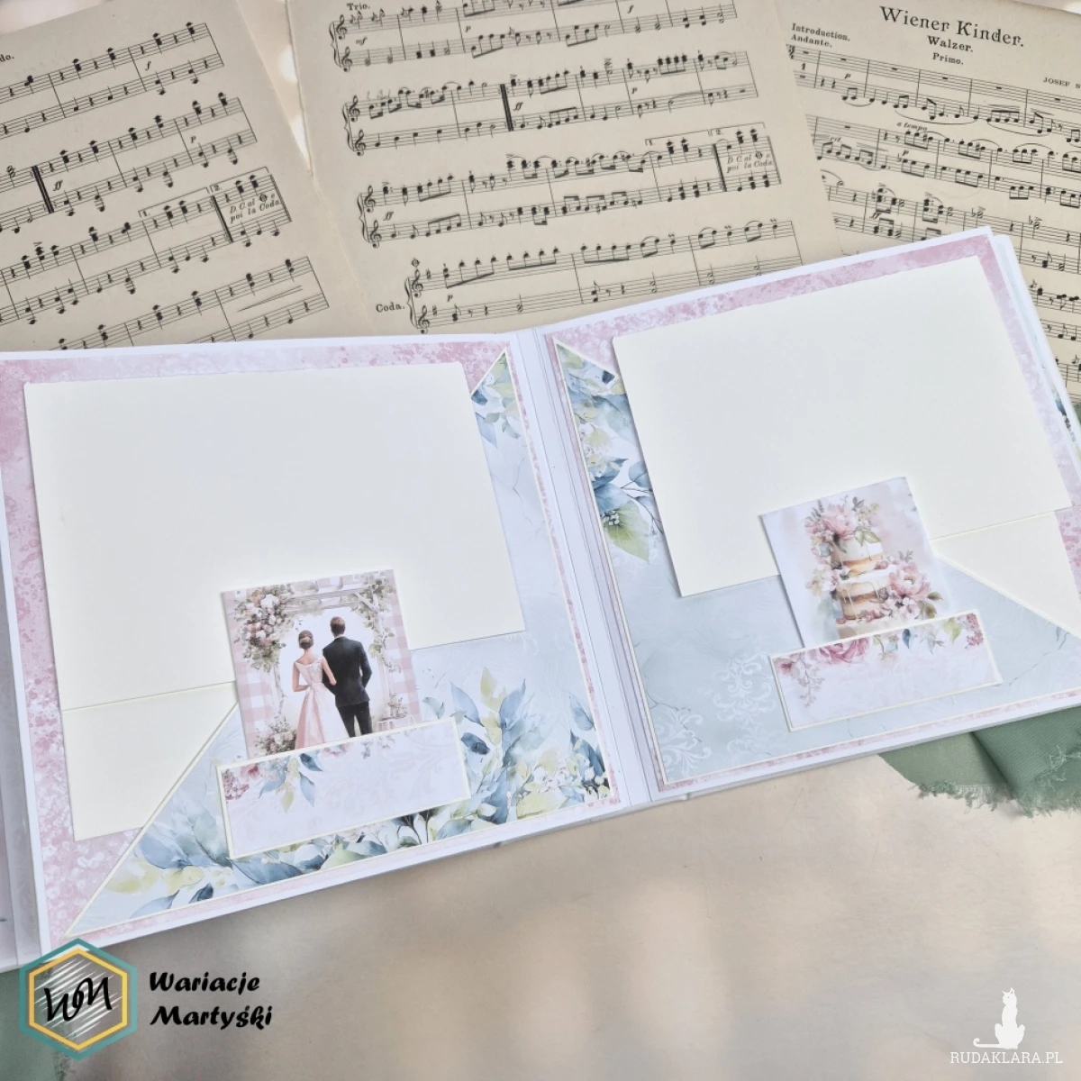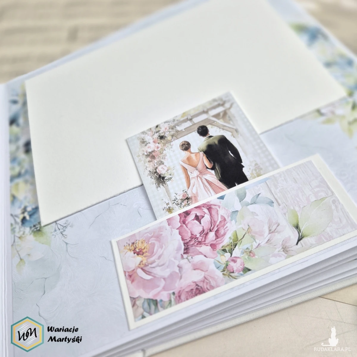 Ten album to spójna i przemyślana całość – od pierwszej strony aż po dopasowane, ręcznie ozdobione pudełko. Delikatna paleta pastelowych barw, romantyczne wzory i subtelne dodatki tworzą wyjątkową oprawę na najważniejsze wspomnienia z dnia ślubu.