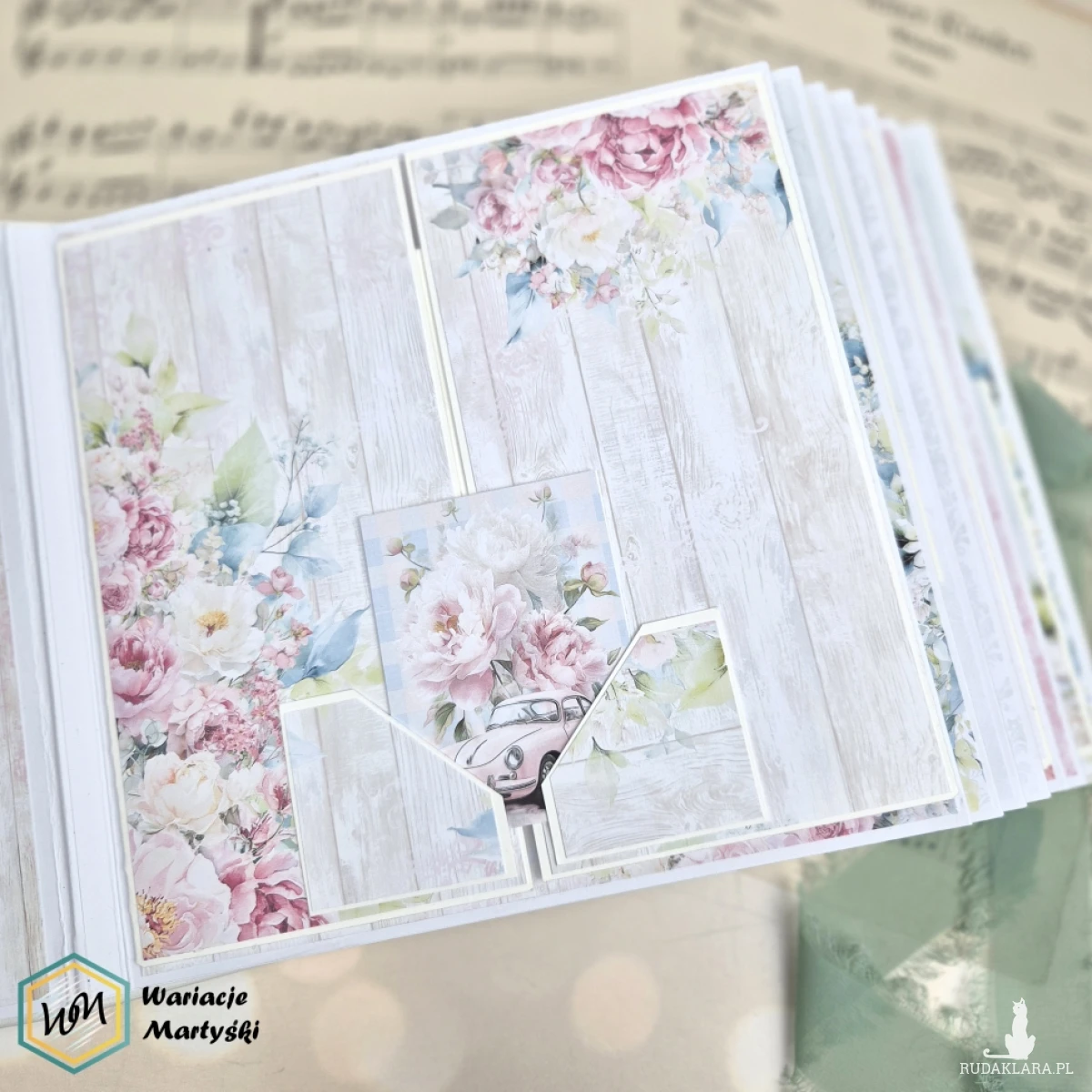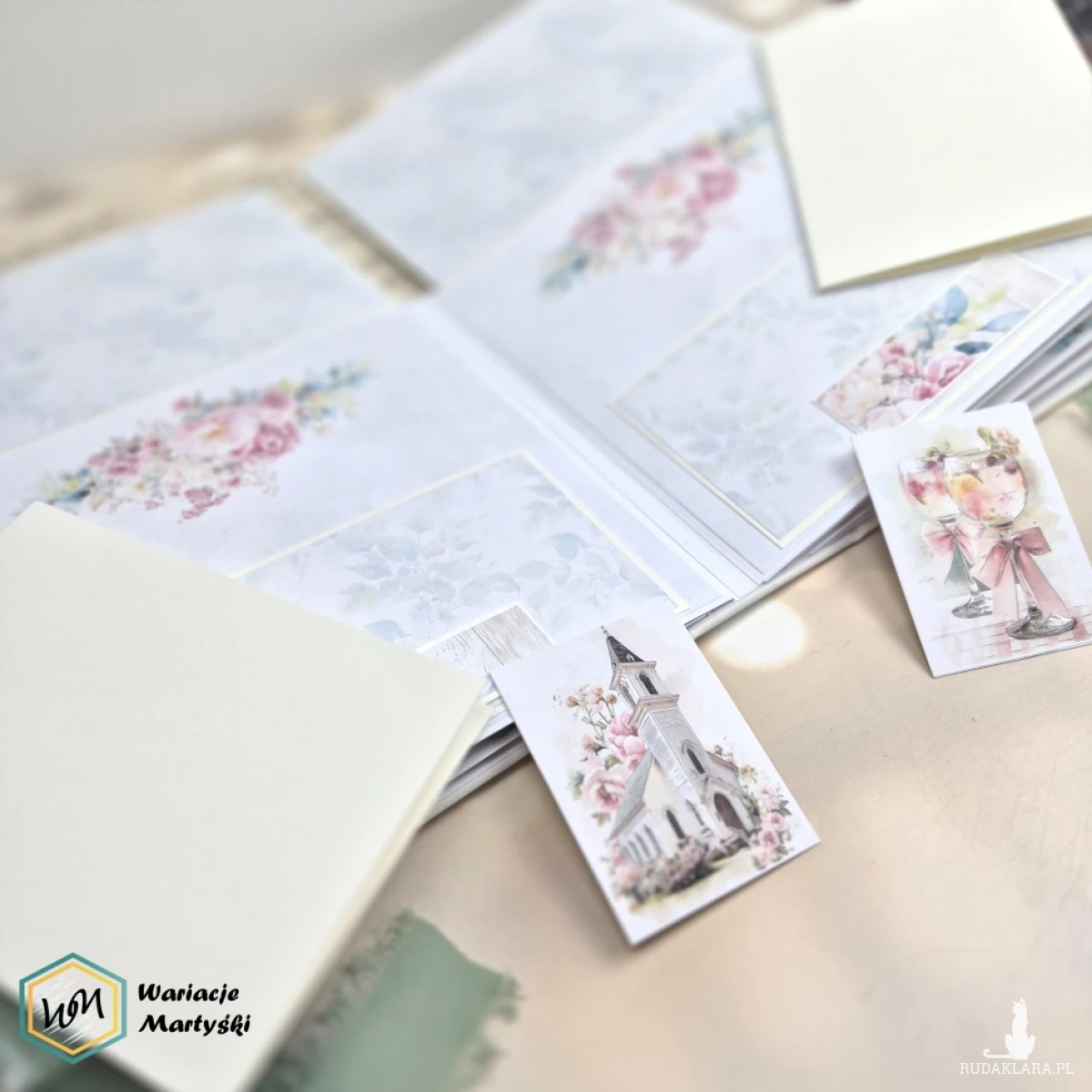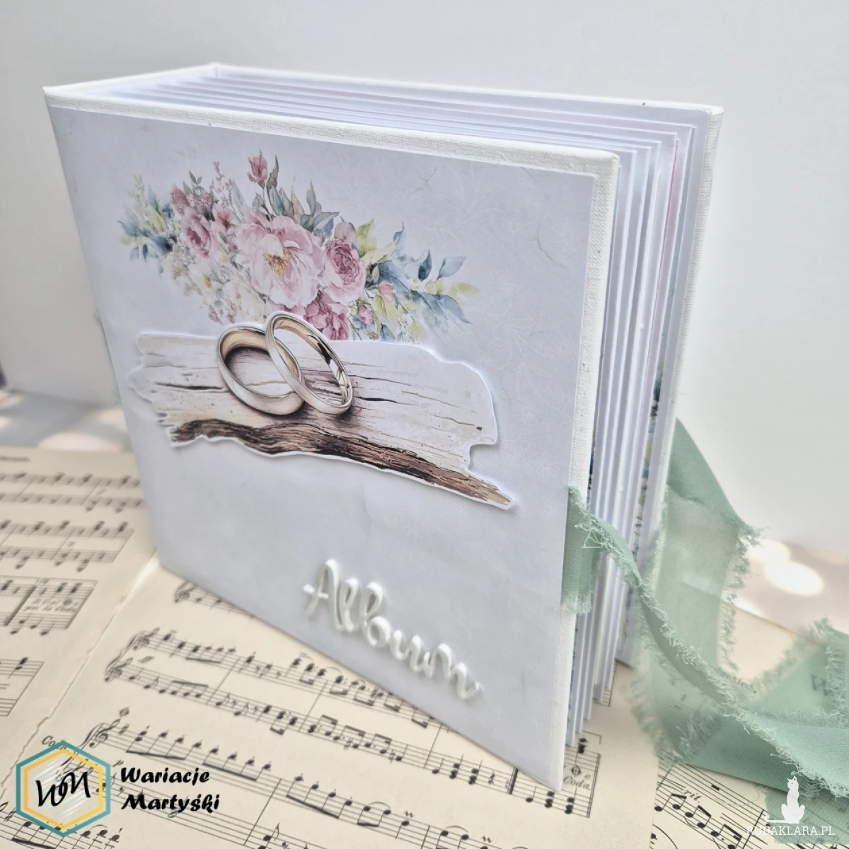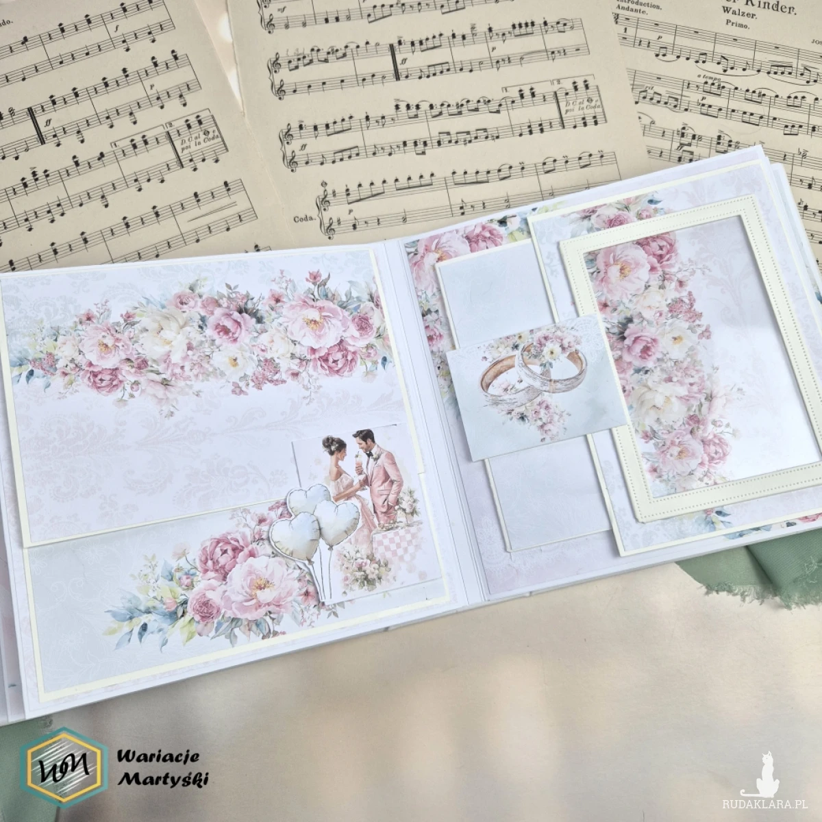Ten album to spójna i przemyślana całość – od pierwszej strony aż po dopasowane, ręcznie ozdobione pudełko. Delikatna paleta pastelowych barw, romantyczne wzory i subtelne dodatki tworzą wyjątkową oprawę na najważniejsze wspomnienia z dnia ślubu.