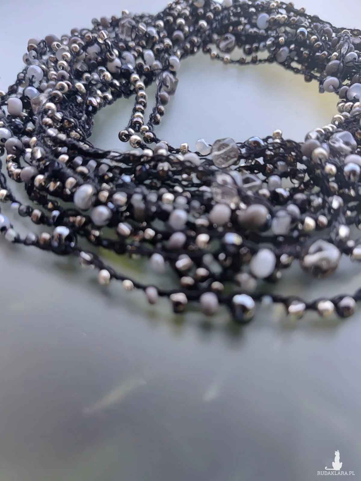 Naszyjnik, Korale długie szare, szklane różnej wielkości na bawełnianej nitce w kolorze czarnym. Cztery oddzielne sznurki bez zapięcia , które można nosić oddzielnie, można dowolnie skracać owijając dwukrotnie wokół szyi. Bardzo dobrze pasują do wielu stylizacji.