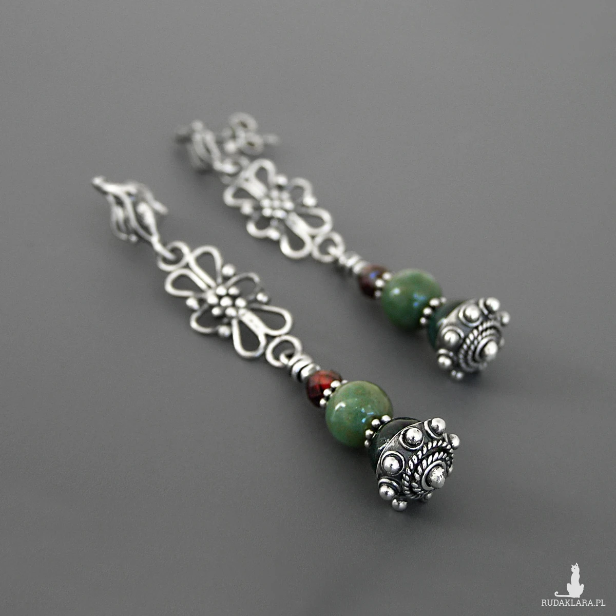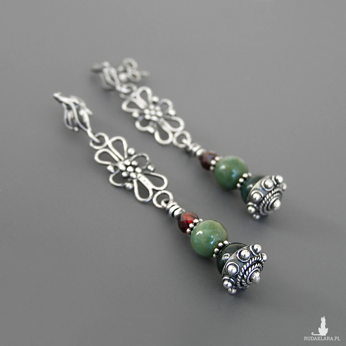 Długie kolczyki retro z kulami agatu mszystego (jasna i ciemna zieleń) z dodatkiem kul fasetowanego granatu.