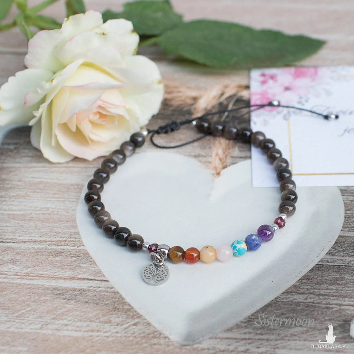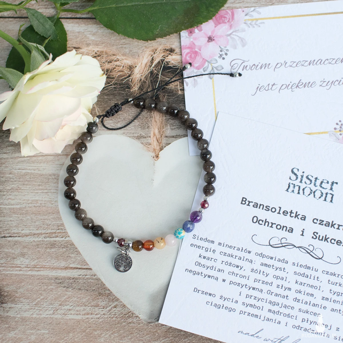 Bransoletkę wysyłam zapakowaną w ozdobny kartonik i woreczek z organzy, z dołączoną etykietą opisową.
