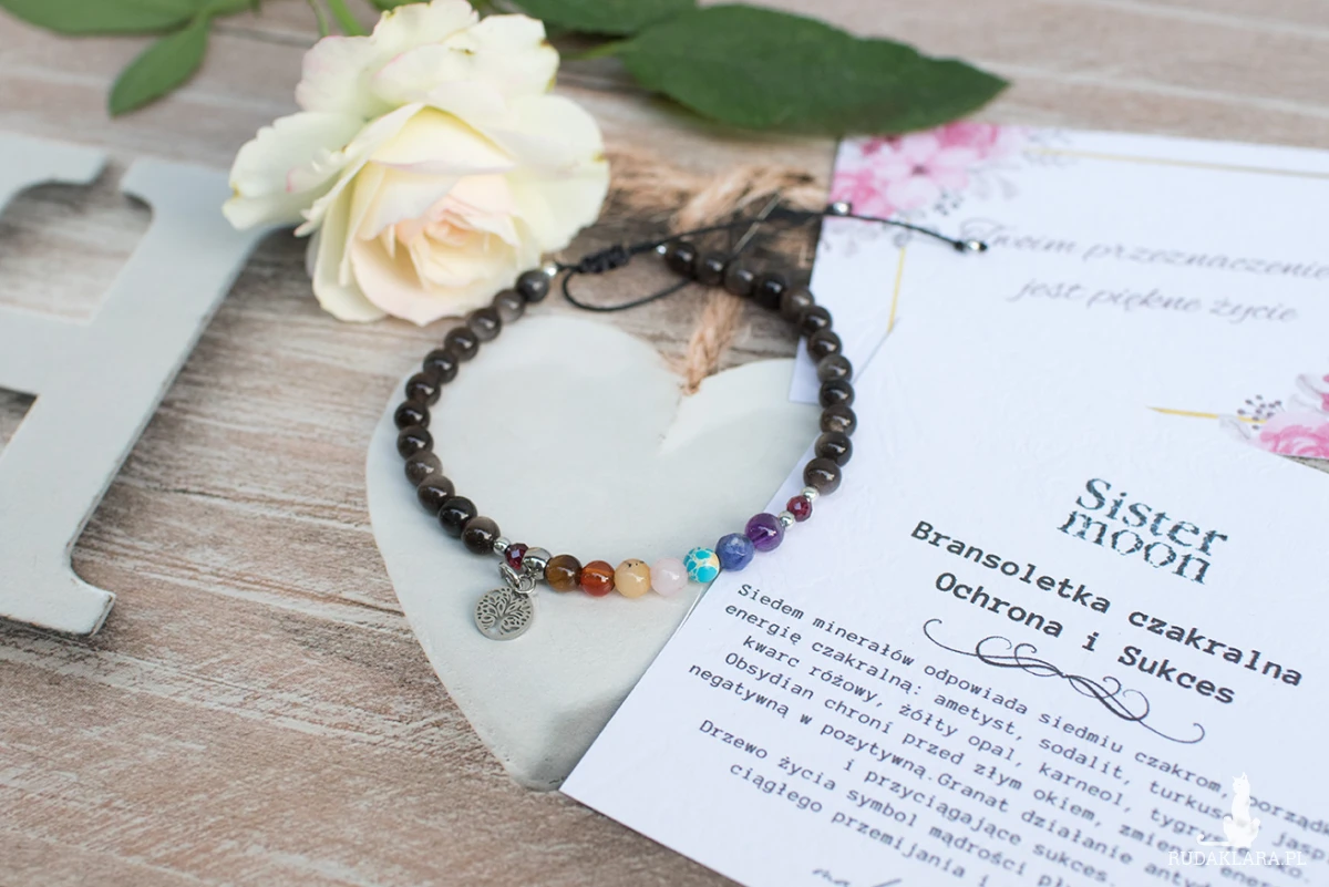 Minimalistyczna bransoletka czakralna Ochrona i Sukces wykonana ręcznie ze starannie wyselekcjonowanych minerałów o średnicy 2, 3 i 4 mm. Siedem minerałów odpowiada siedmiu czakrom (ametyst, sodalit, turkusowy jaspis, kwarc różowy, żółty opal, karneol, tygrysie oko), ich zadaniem jest porządkowanie i harmonijny rozwój energii czakralnej. Ósmy minerał – obsydian srebrzysty – potężny kamień ochronny, wzmacnia asertywność, chroni przed złą energią i zmienia ją w pozytywną. Pomaga zwalczać negatywne myśli, ułatwia zapamiętanie i rozumienie snów. Są też obecne kulki hematytu – hematyt – dodaje odwagi, budzi radość życia i pomaga w pokonywaniu przeciwności losu. Dodatek dwóch kulek granatu dla ochrony przed depresją i przyciągania sukcesu.