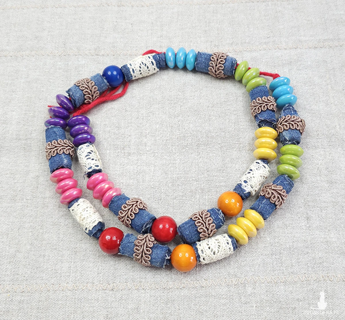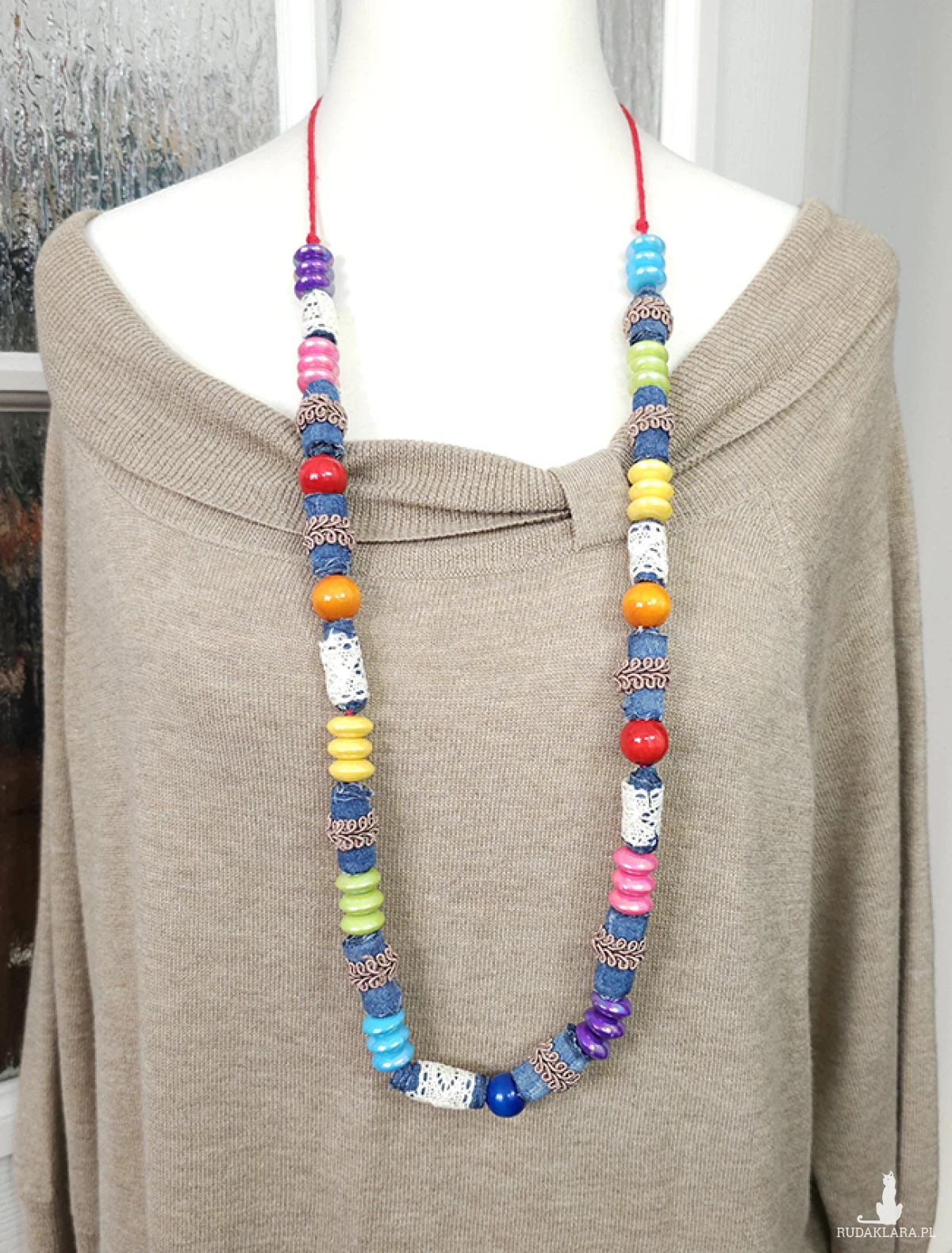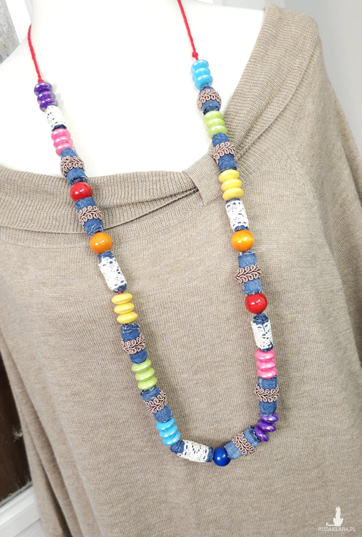 Naszyjnik stworzony został z ręcznie robionych, jeansowych korali, które powstały w procesie upcyklingu - dając starym materiałom nowe życie!