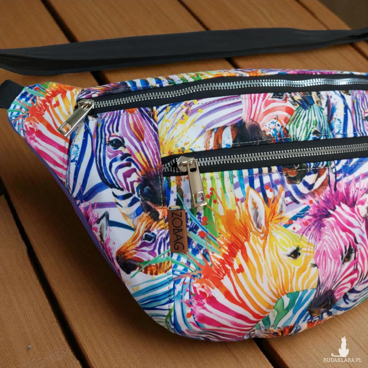 Saszetka-nerka uszyta z tkaniny wodoodpornej wzór oraz na tyle fioletowa ekoskóra.