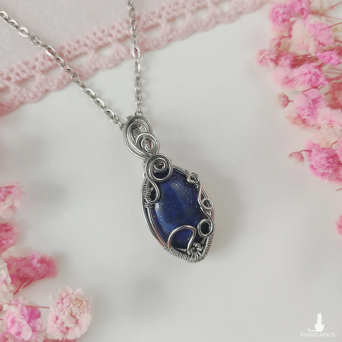Naszyjnik Lapis Lazuli ręcznie wykonany z drutów ze stali chirurgicznej metodą wire wrapping.