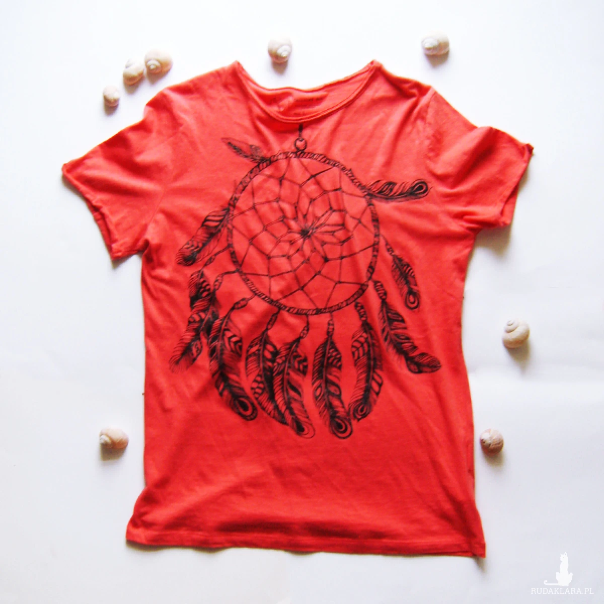 Nowa, czerwona koszulka z czarnym nadrukiem wzór - łapacz snów. Rozmiar L. Materiał: 100 % bawełna, prać w 30 stopniach.