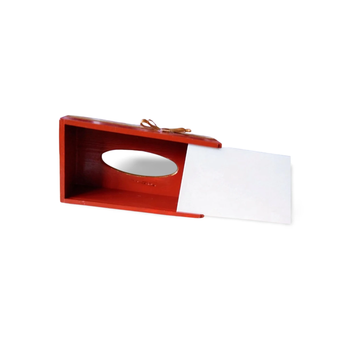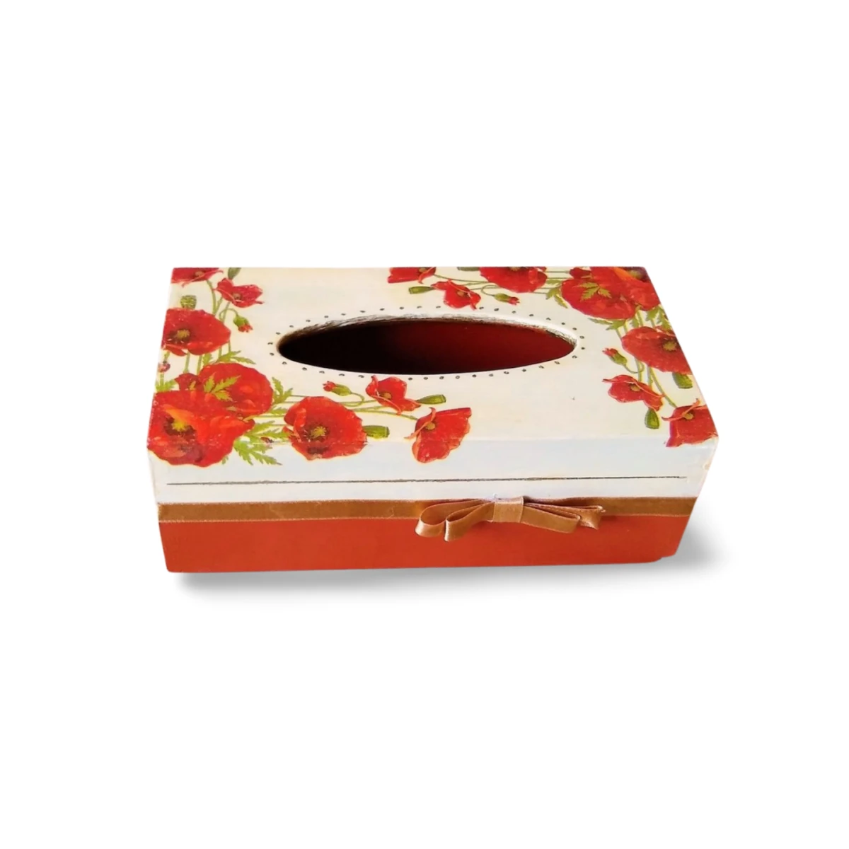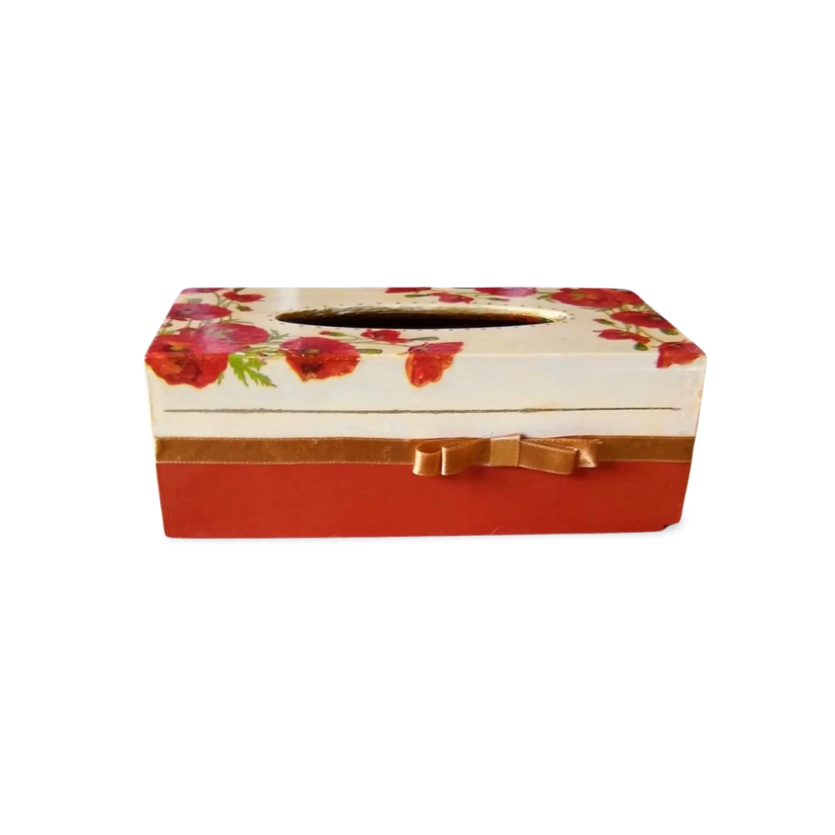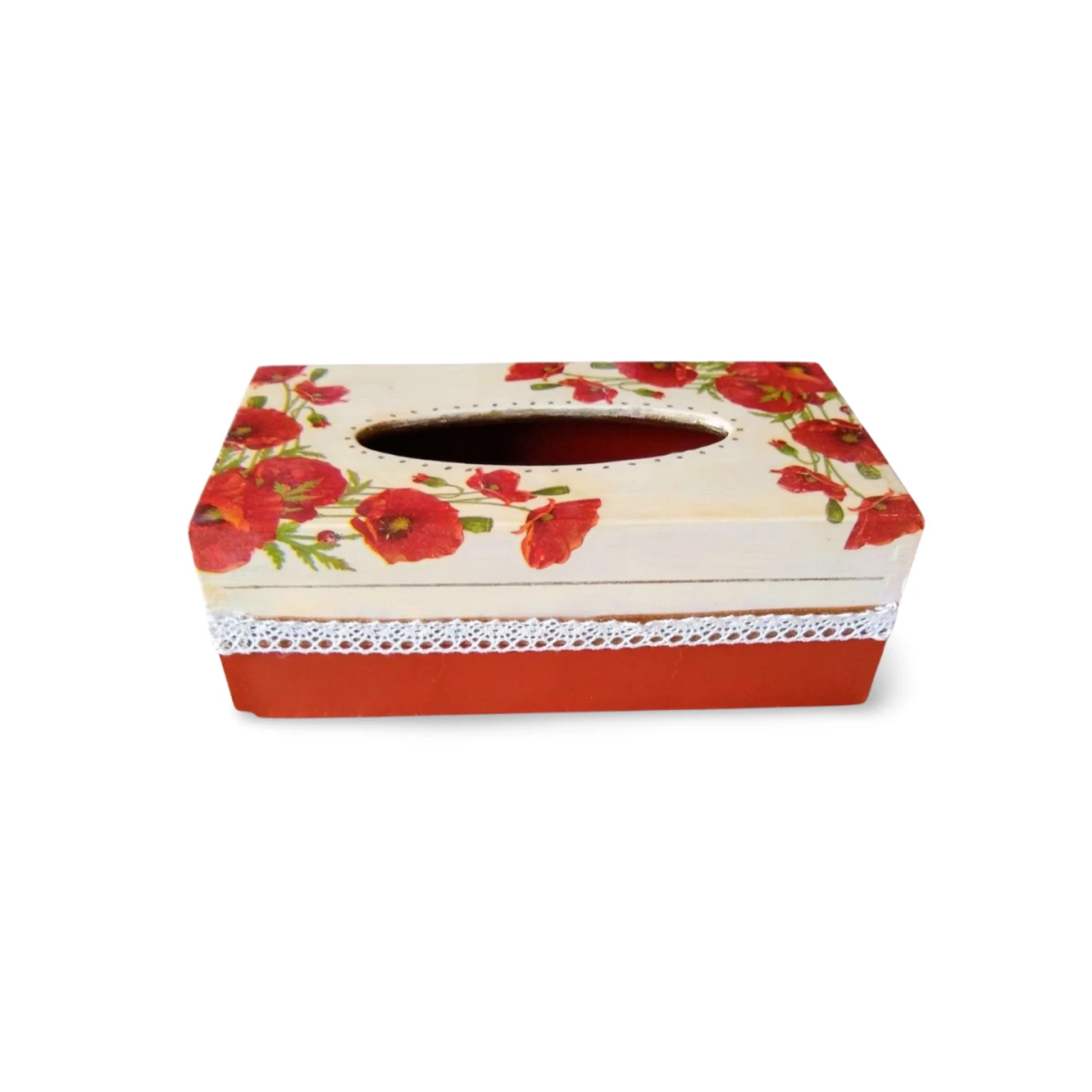 Drewniany chustecznik prostokątny, ręcznie wykonany, malowany i ozdobiony metodą decoupage. Otwierany od dołu. Wielkość klasyczna, mieści się w nim prostokątne pudełko chusteczek higienicznych. Całość zabezpieczona lakierem akrylowym.