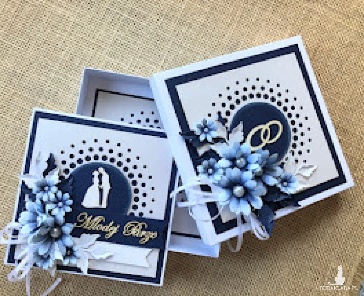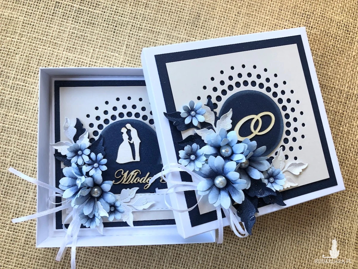 Kartka z okazji ślubu wykonana ręcznie z niezwykłą starannością i dbałością o każdy detal. Na bazie z papieru scrapowego białego. Całość utrzymana w kolorystyce bieli z dodatkiem granatu i srebra z elegancką kwiatową kompozycją, piękną ażurową bazą Rozmiar ok 14 x 14 cm. Wewnątrz kartki znajdują się gotowe życzenia oraz umieszczono kieszonkę na małe co nieco lub kupon lotto. .W komplecie pudełko z papieru scrapowego (rozmiar 15,5 x 15,5 cm) ozdobione tak jak kartka .W tej postaci komplet dostępny od ręki.