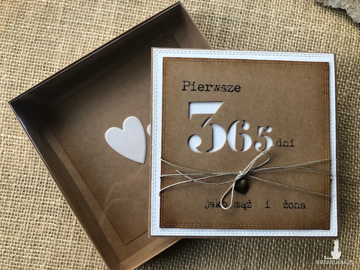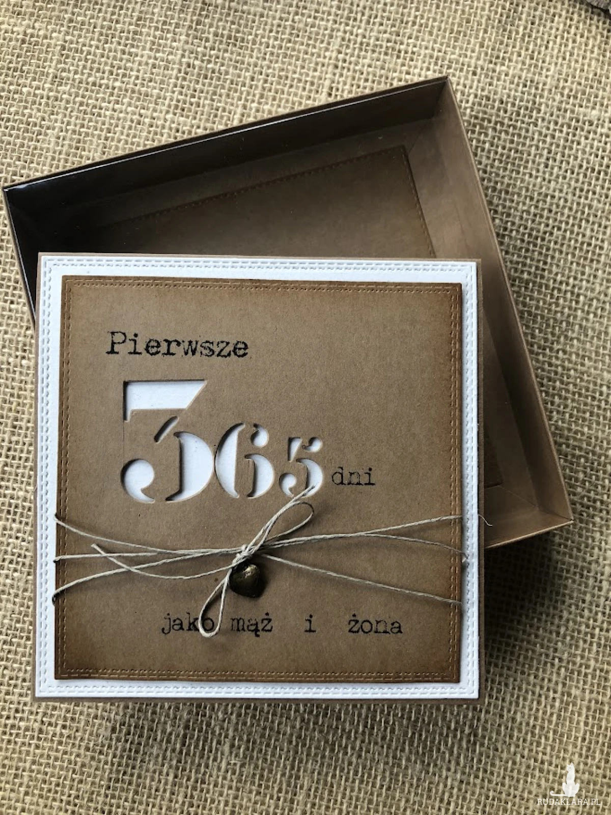Kartka z okazji pierwszej rocznicy ślubu.Kartka w pudełku w stylu kraftowym. Wymiar kartki 14,0 x 14,0 ,pudełka 15,5 x 15,5 z kwadratowym okienkiem.Wewnątrz kartki miejsce na wypisanie życzeń oraz kieszonka na małe co nieco. Pudełko przewiązane tagiem. Produkt gotowy do natychmiastowej wysyłki