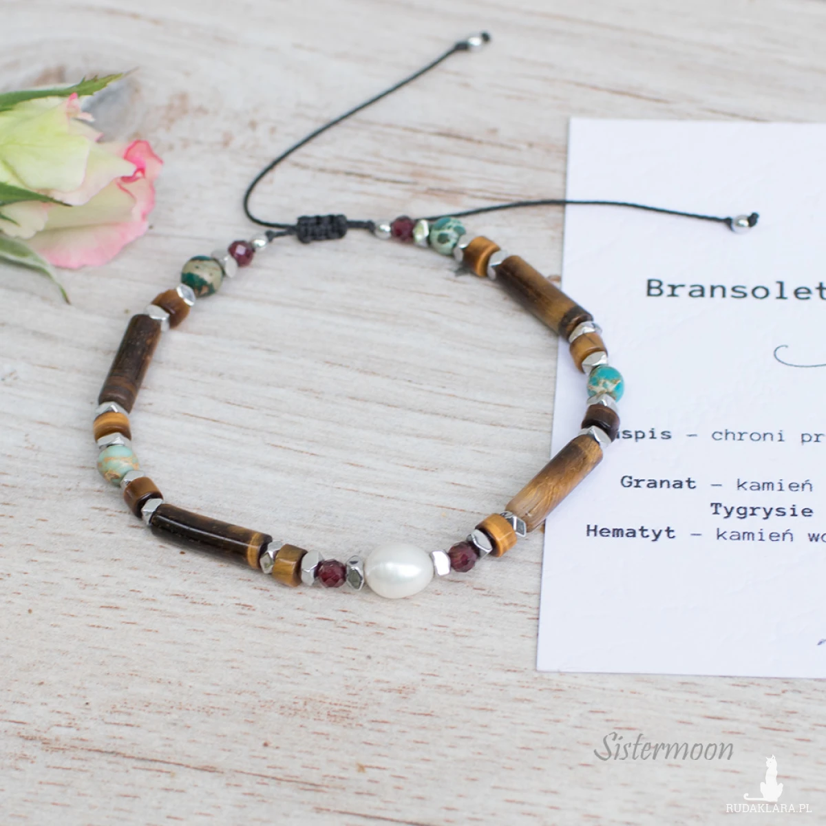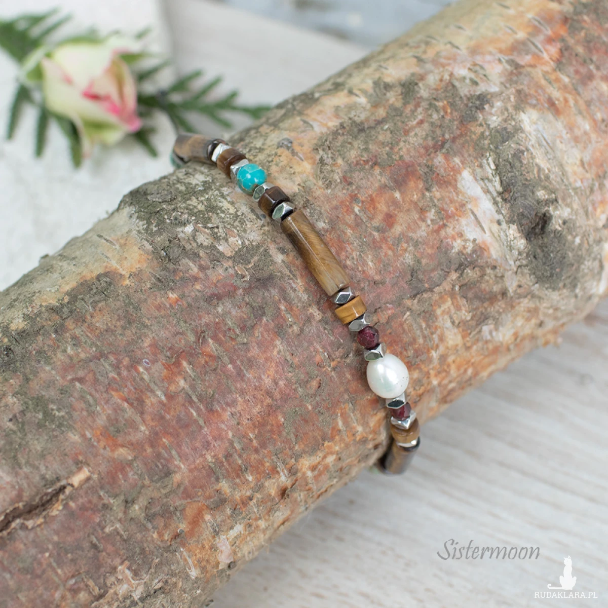 Bransoletka dobrych życzeń w turkusie i brązie. Damska bransoletka z minerałami – idealna na prezent. Pełna mocy i z ukrytym znaczeniem. Bransoletka wykonana ze starannie dobranych minerałów: perełka rzeczna, jaspis turkusowy, tygrysie oko, granat, hematyty, minerały o średnicy 2, 3 i 4 mm.