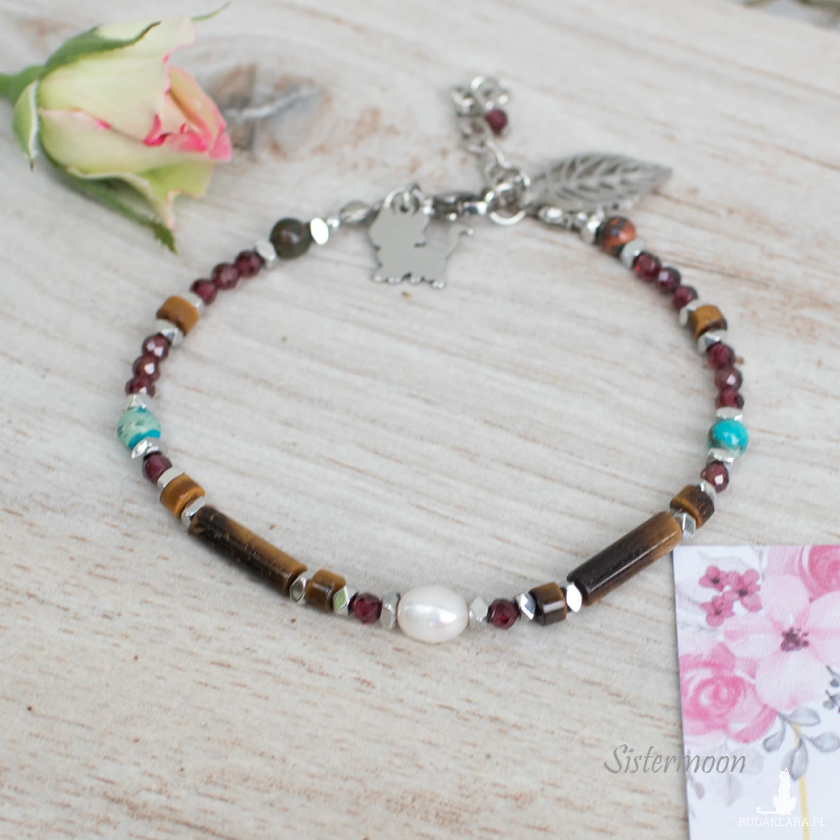 Bransoletka tygrysie oko dobrych życzeń. Damska bransoletka z minerałami – idealna na prezent. Pełna mocy i z ukrytym znaczeniem. Bransoletka wykonana ze starannie dobranych minerałów: perełka rzeczna, jaspis turkusowy, tygrysie oko, granat, hematyty, minerały o średnicy 2, 3 i 4 mm. Zawieszki: kot i listek, stal szlachetna.