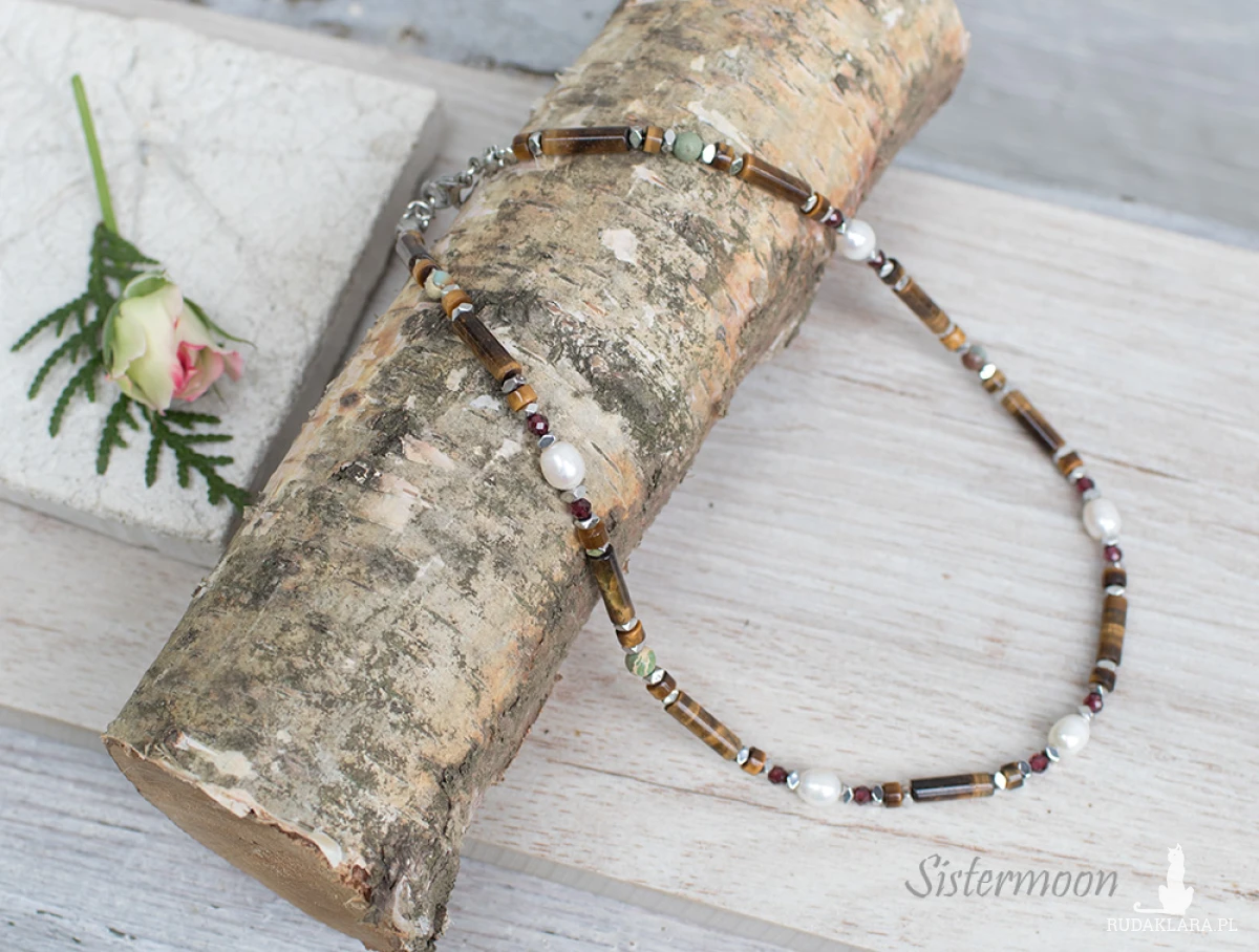 Wykonanie: Elementy wysokiej jakości ze stali szlachetnej, białe perełki rzeczne, tygrysie oko, granaty, hematyty. Zapinanie na karabińczyk z łańcuszkową przedłużką. Długość: 40 cm plus 4 cm łańcuszek.