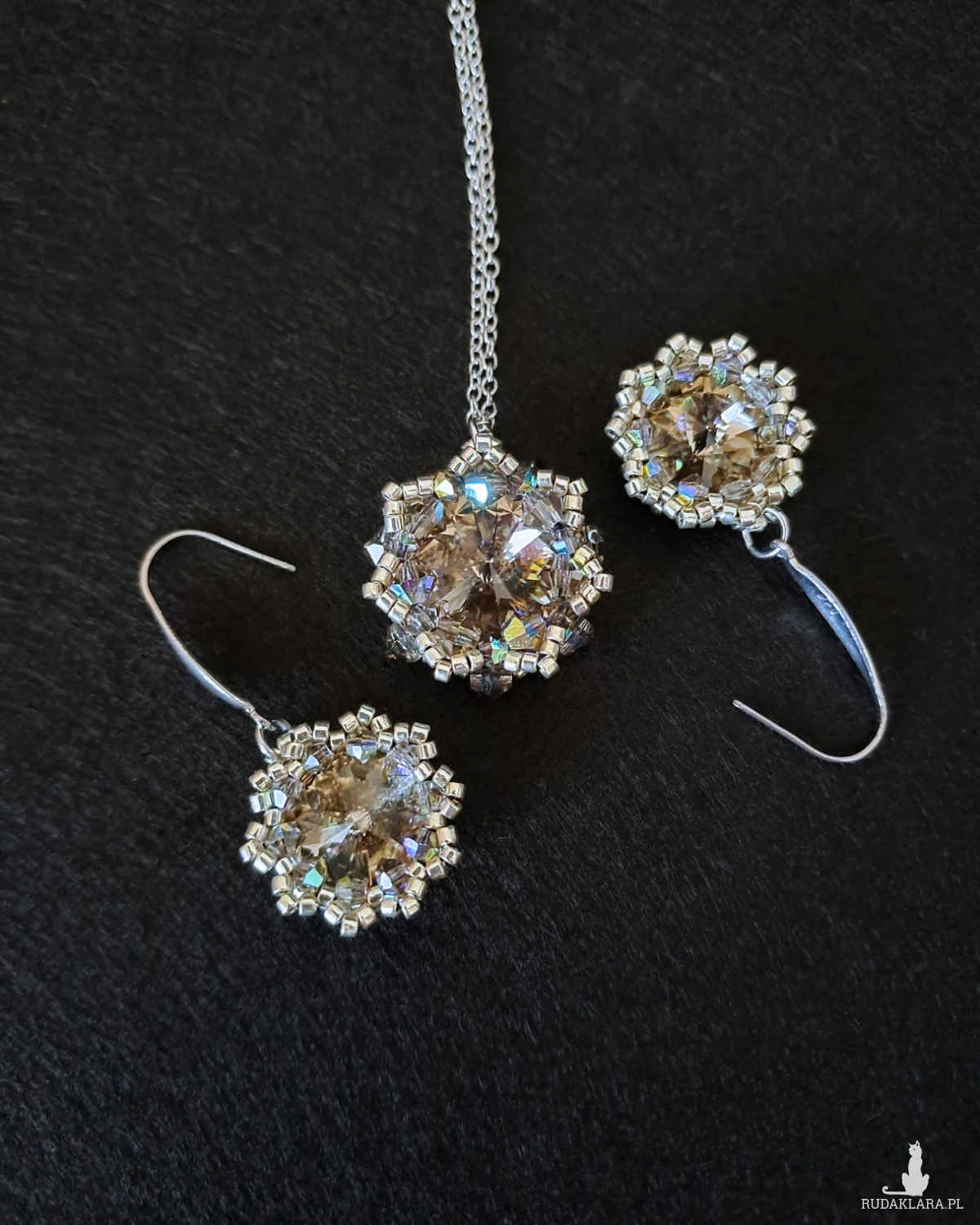 Zawieszka naszyjnika (ok. 2,7 × 2,5 cm) została wykonana z kryształu Preciosa Crystal Maxima, otoczonego kryształkami Bicone i srebrnymi koralikami Miyuki. Całość zawieszona jest na stalowym łańcuszku typu ankier o długości 45 cm + 5 cm przedłużka.