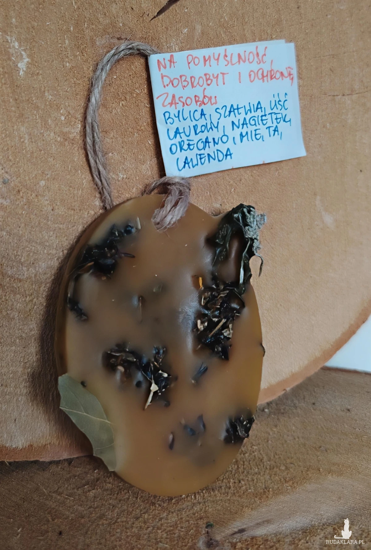 Zawieszka z wosku pszczelego z zatopionymi ziołami to nie tylko piękny naturalny dodatek do wnętrza, ale też pełen symbolicznej i magicznej mocy talizman. Każde z tych ziół wnosi inną energię, a w połączeniu tworzą ochronną, oczyszczającą i wzmacniającą aurę