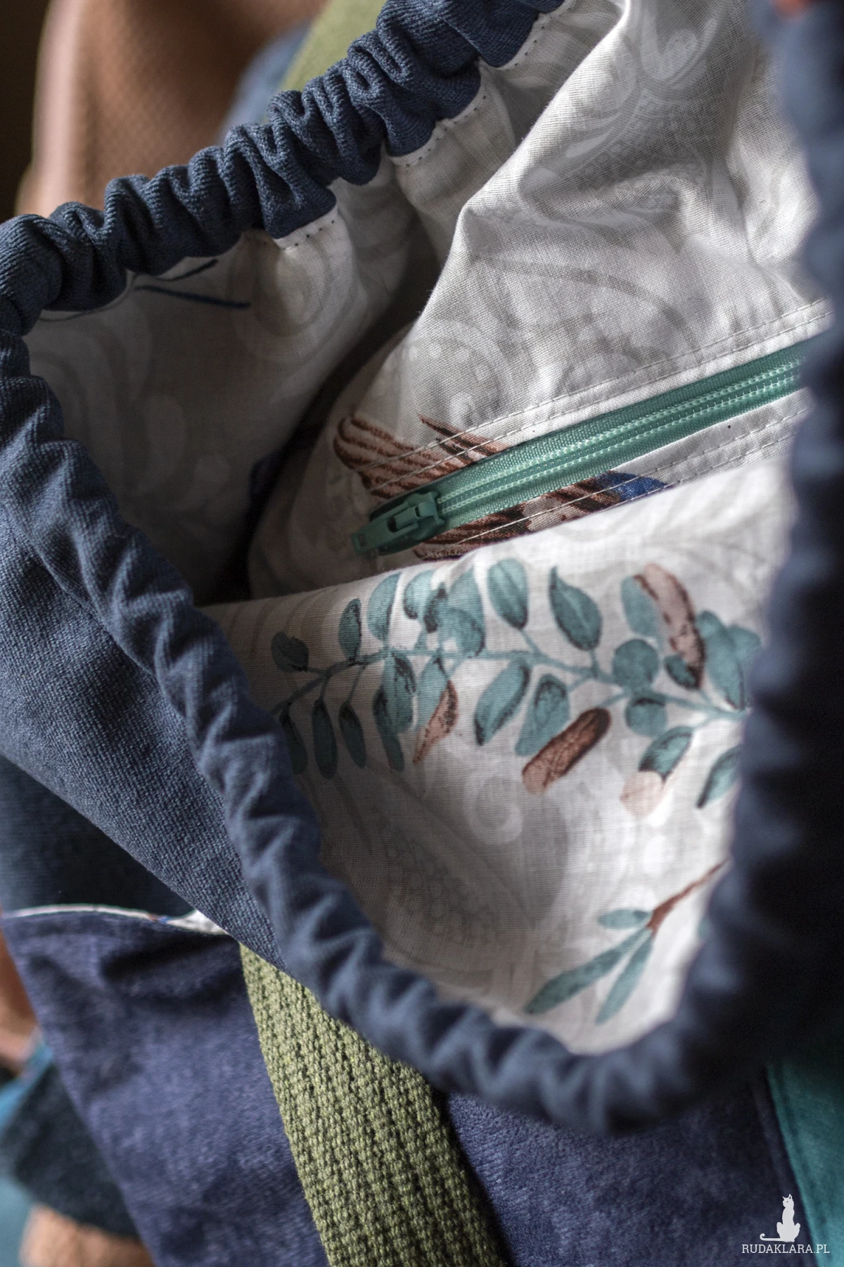 Wykonana z tkaniny w kolorze granatowym, z przodu dwie kieszenie z kilku rodzajów kolorowych tkanin. Bawełniane, oliwkowe pasy i jasna, bawełniana podszewka w kwiaty.