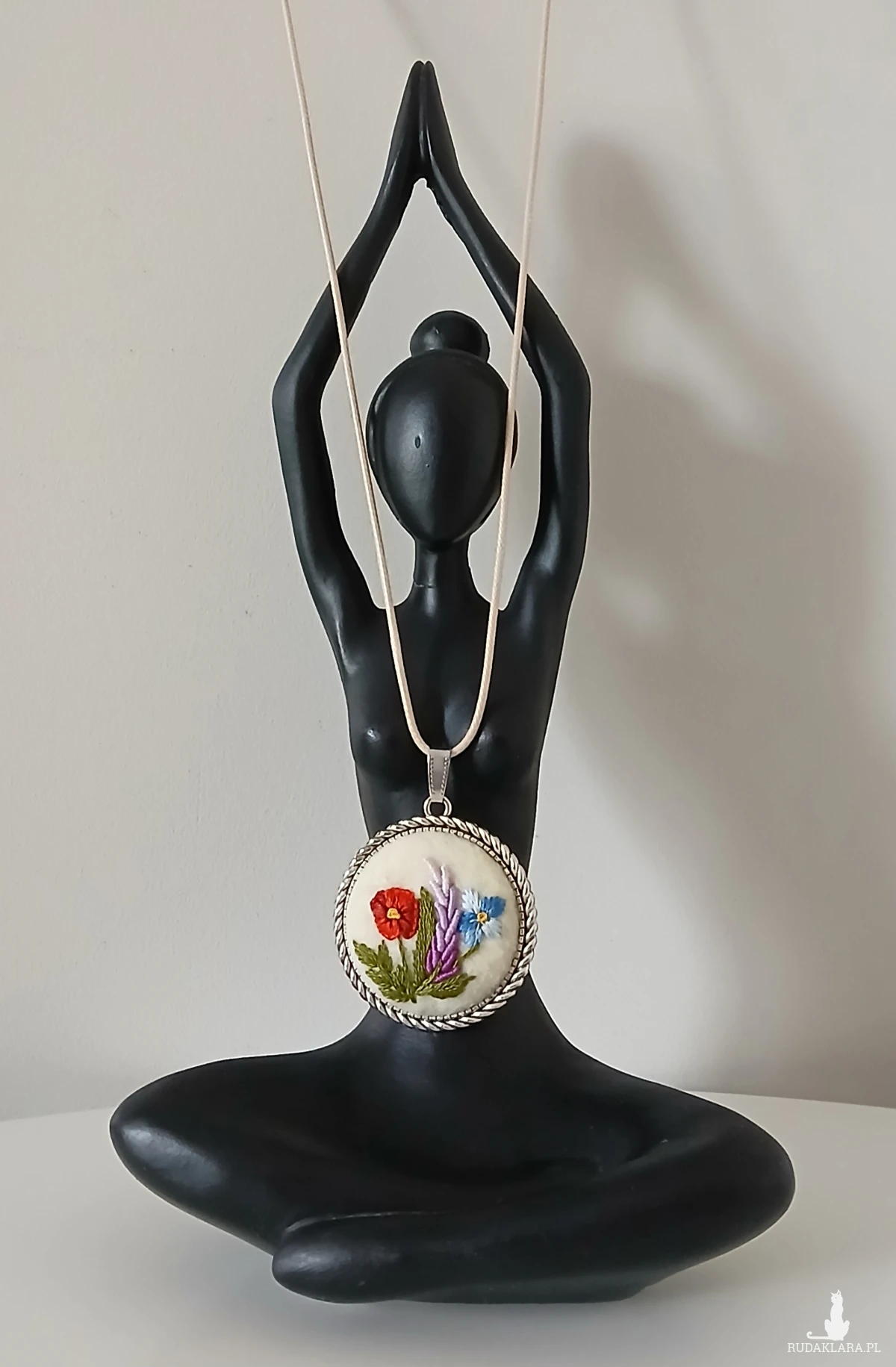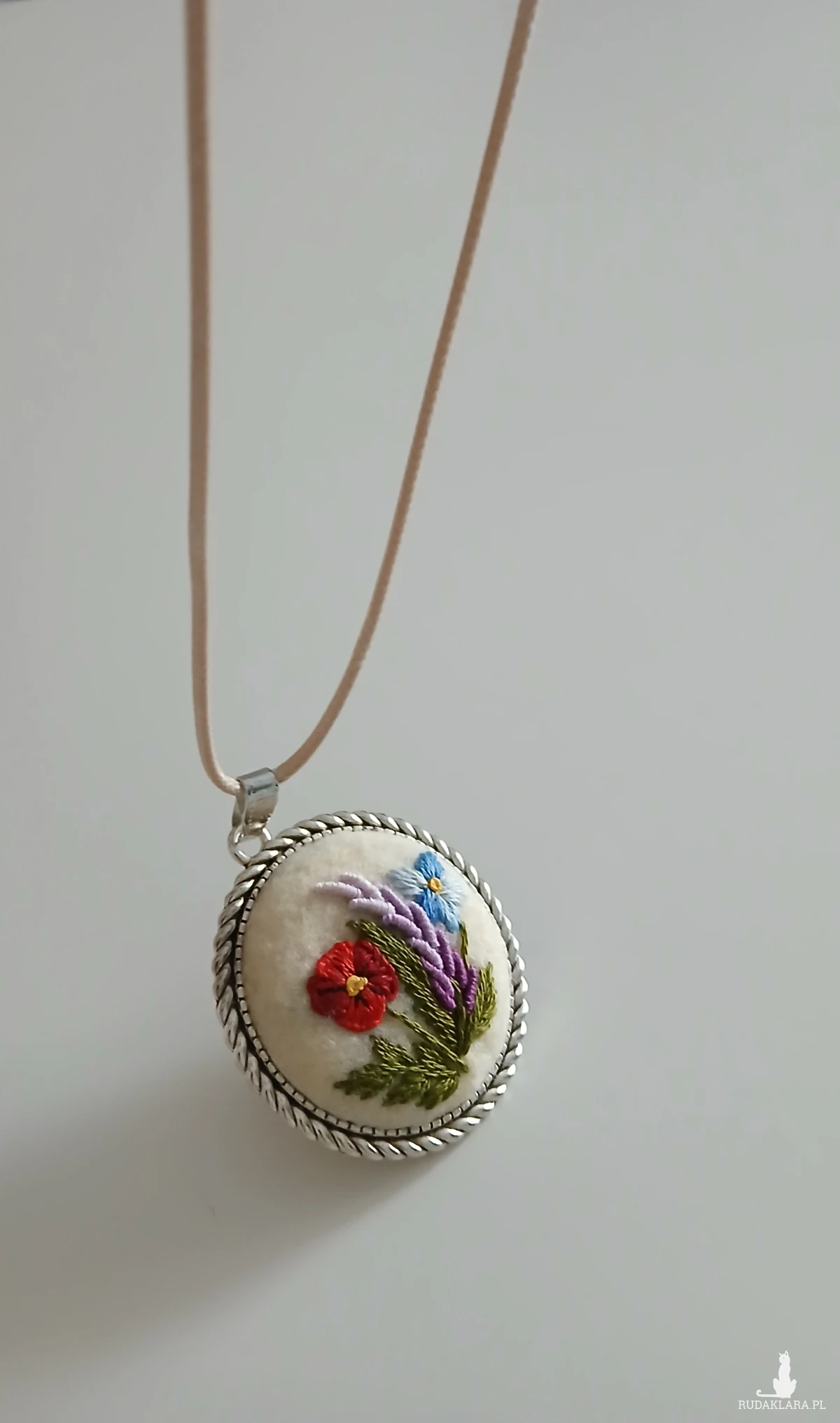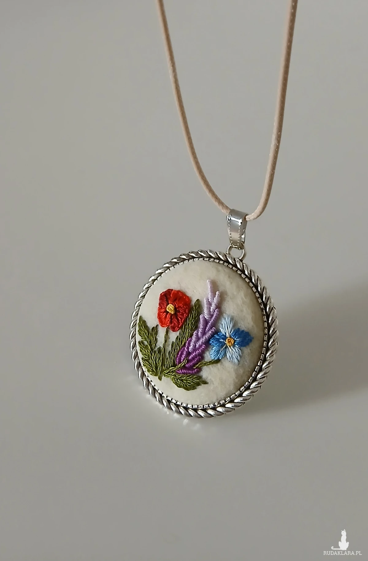 Perfekcyjnie dopracowany haft na filcu wykonałam polską bawełnianą muliną za pomocą igły. Jest on zabezpieczony impregnatem do tkanin ale po dłuższym użytkowaniu można go odświeżyć przy pomocy delikatnego mydła i letniej wody.