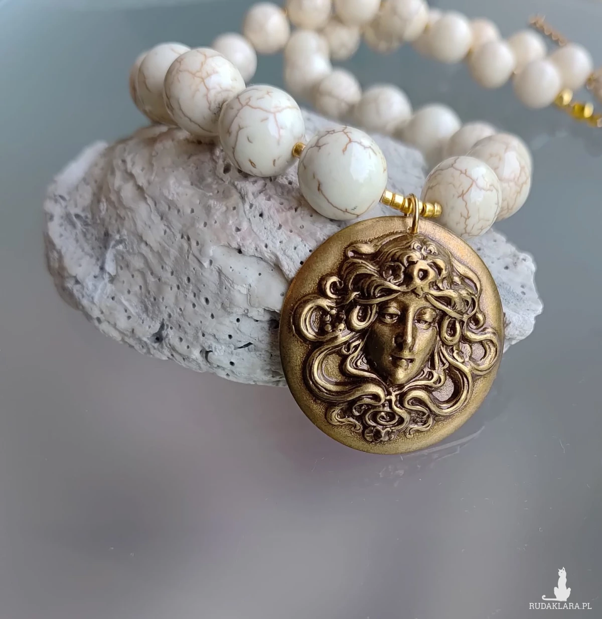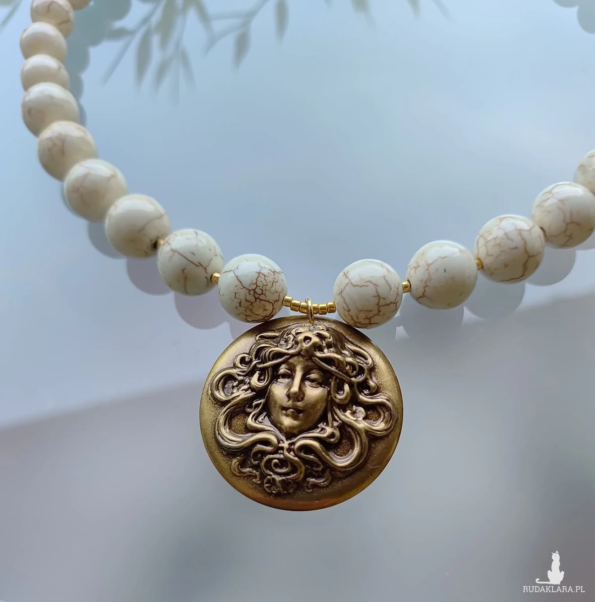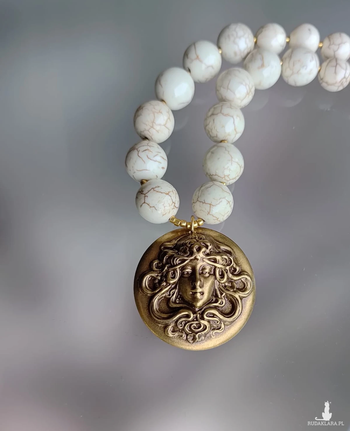 Naszyjnik z dużych kul howlitu de lux. Kule 10 i 12 mm z przekładkami ze złotych japońskich koralików. Wisior duży 35 mm, piękna mosiężna wytłoczka meduzy. Objętość 44 cm plus łańcuszek 5 cm , zapięcie ze stali nierdzewnej. Naszyjnik z piękną cameą z czeskiego szkła, bogata w detale, w filigranowej oprawie , mosiężnej w kolorze starego złota. Korale kulki howlitu de lux, duże kulki howlitu 10 mm w kolorze kości słoniowej z delikatnymi żyłkami.Wykończenie ze stali w kolorze złotym. Objętość 42 cm plus łańcuszek 5 cm