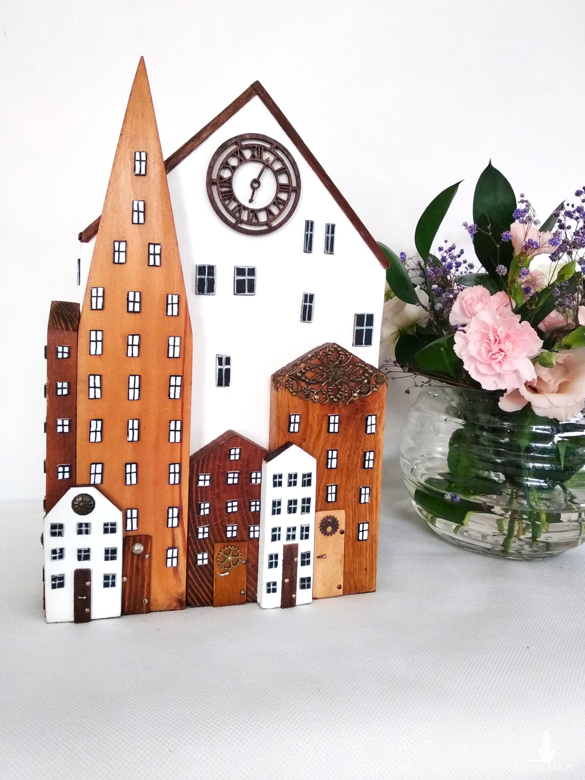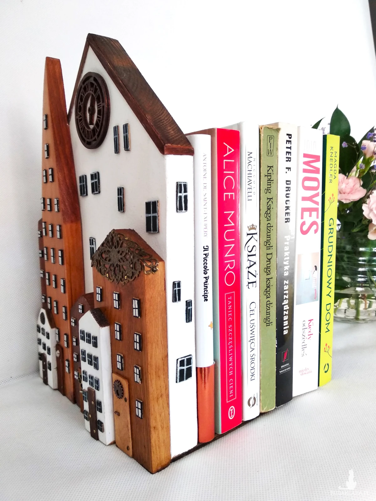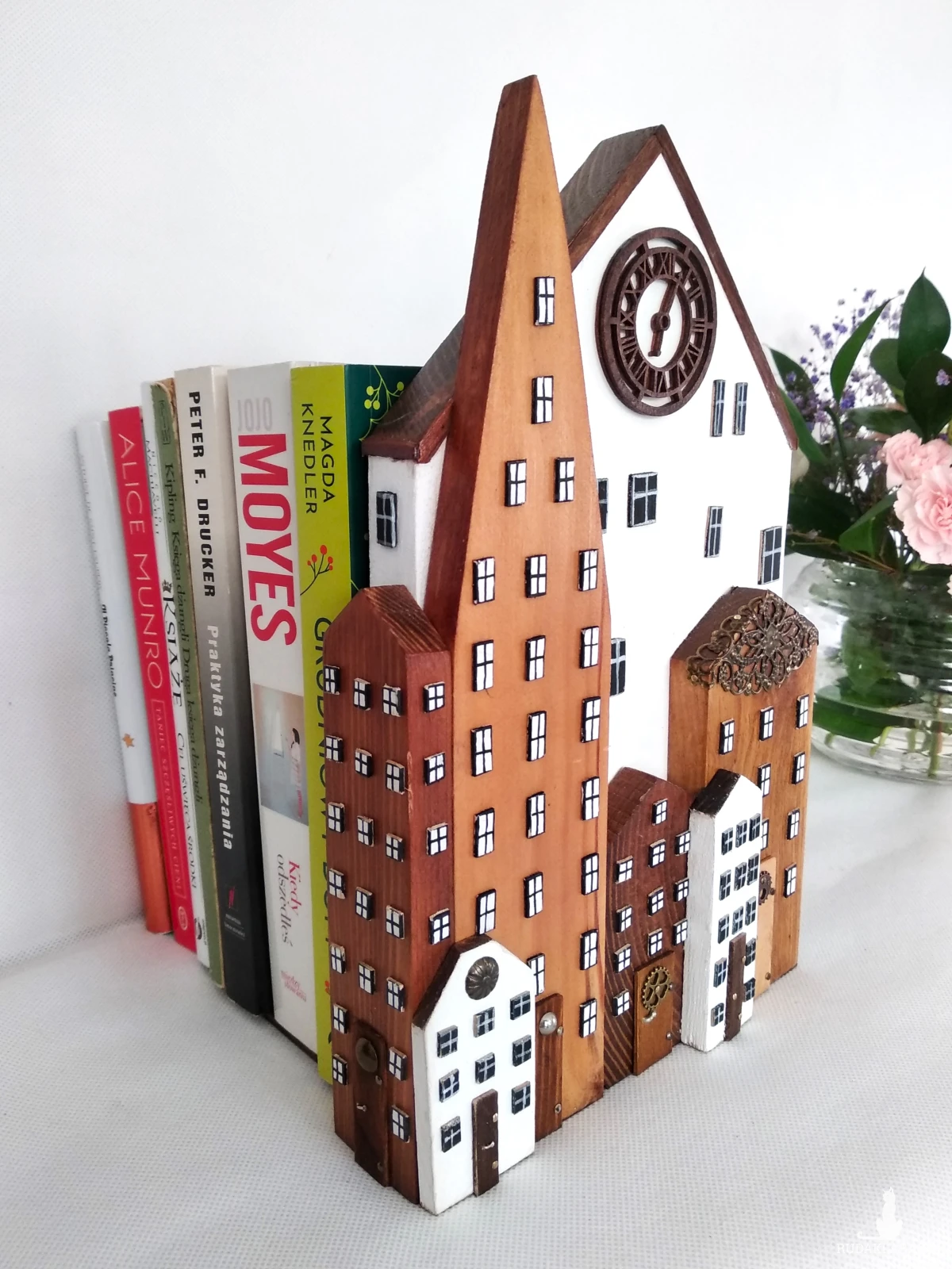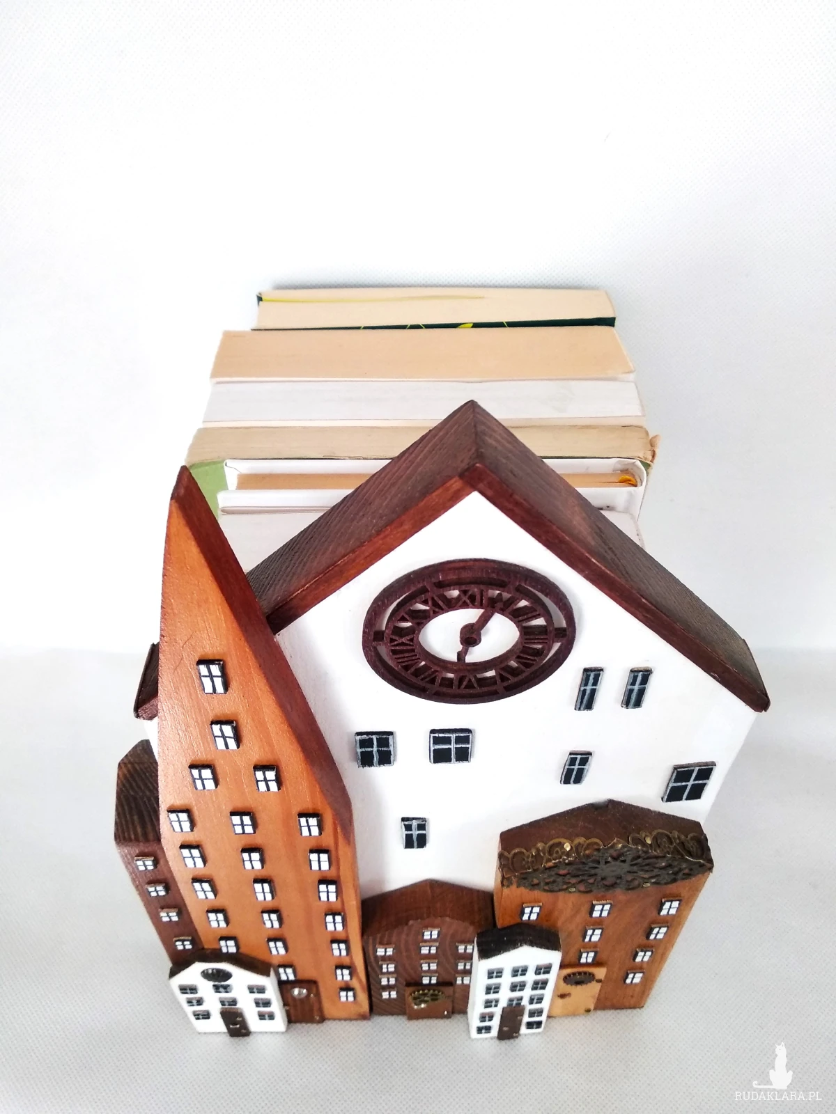 Dekoracyjna podpórka do książek, która wygląda jak miniaturowe miasto,