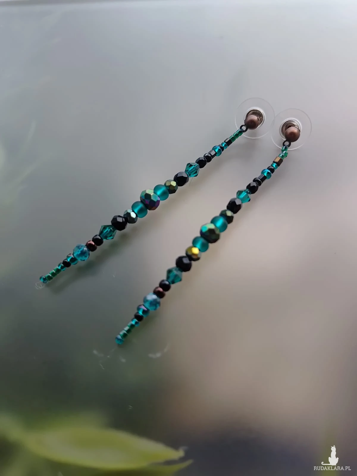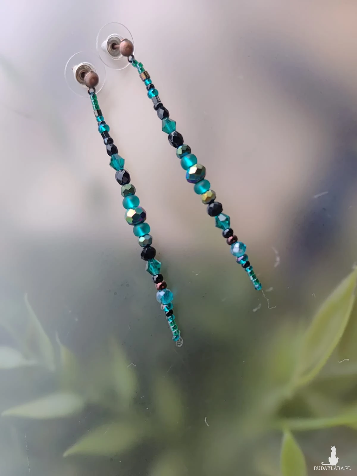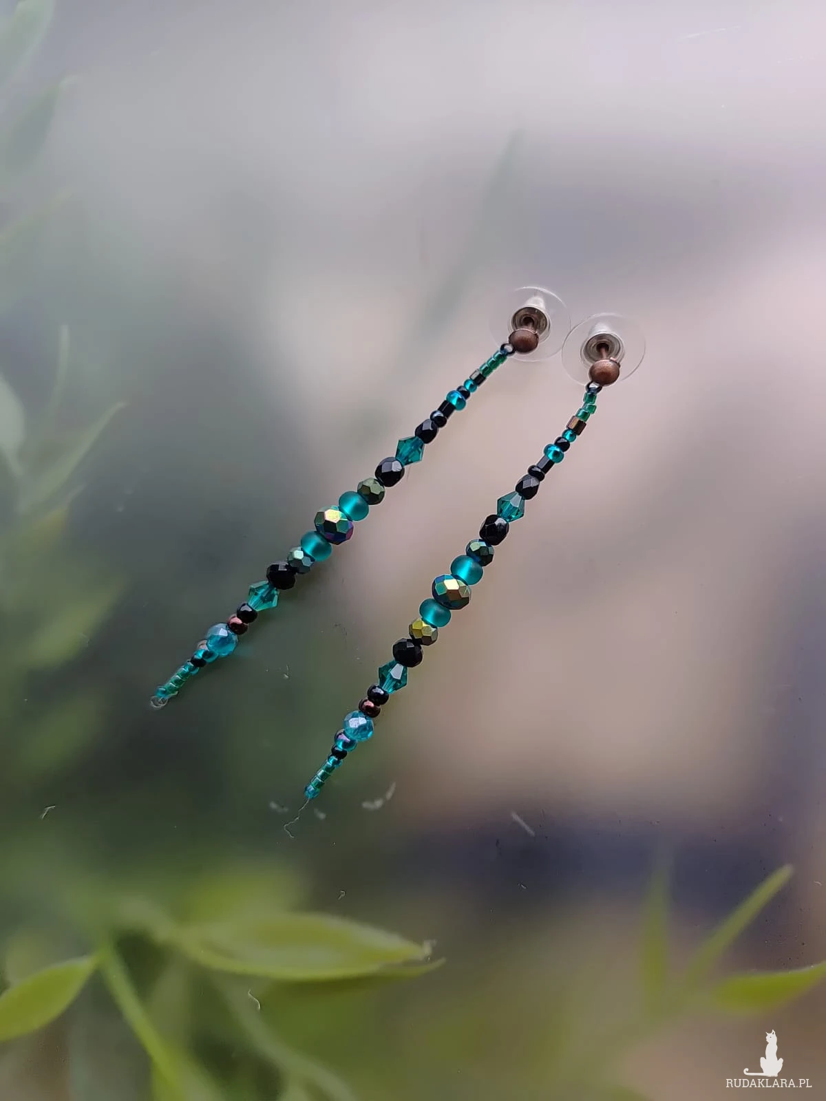Kolczyki minimalistyczne cienkie nitki z koralikami. Koraliki szklane kolorowe. Długość 7 cm, metalowe sztyfty, silikonowy baranek.