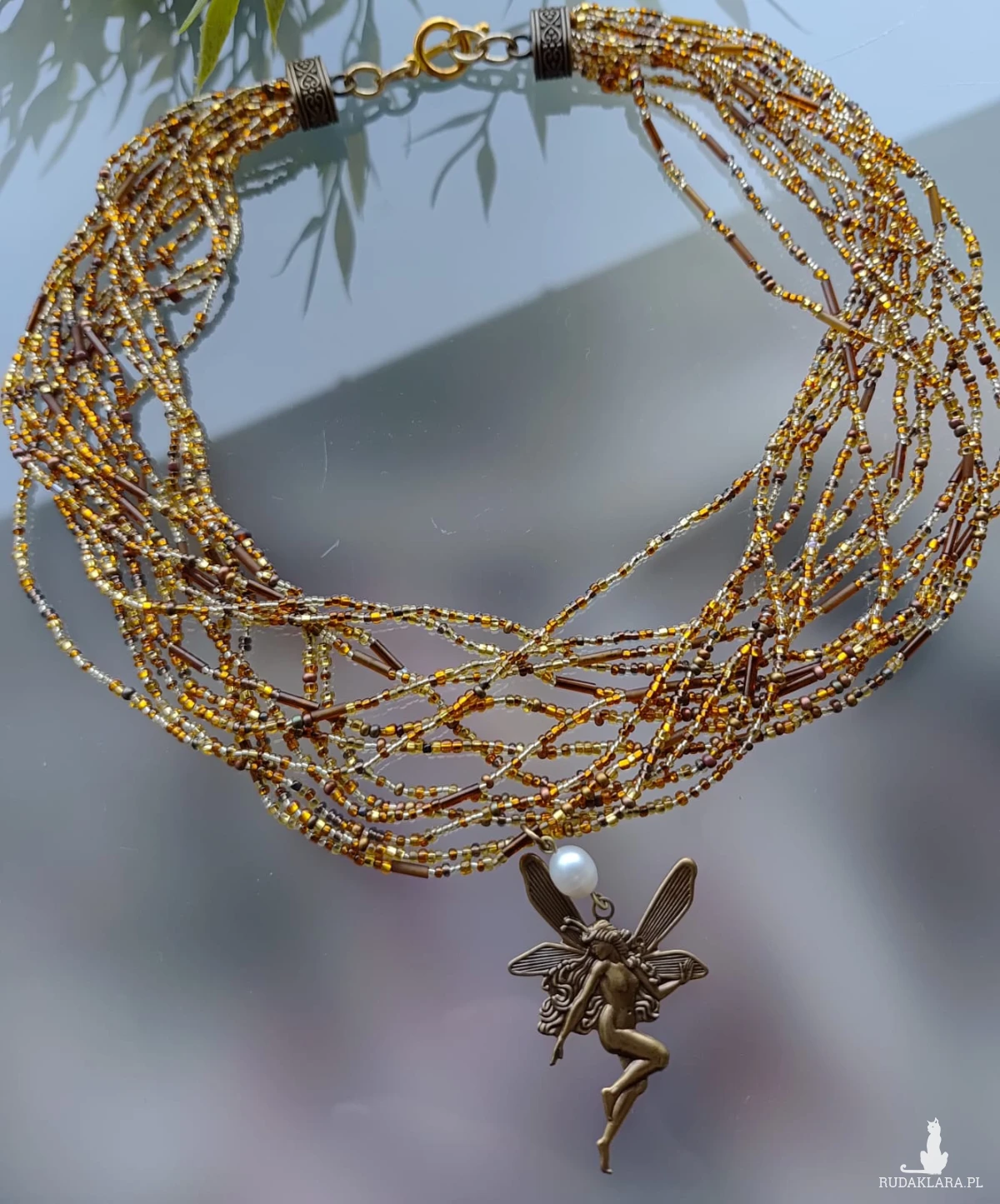 Naszyjnik z koralików szklanych w brązowym i złotym kolorze. Wisiorek floral mosiężna wytłoczka Wróżki. Objętość 46 cm bez regulacji, zapięcie metalowe w kolorze złotym. Wisiorek z perłą 5 cm