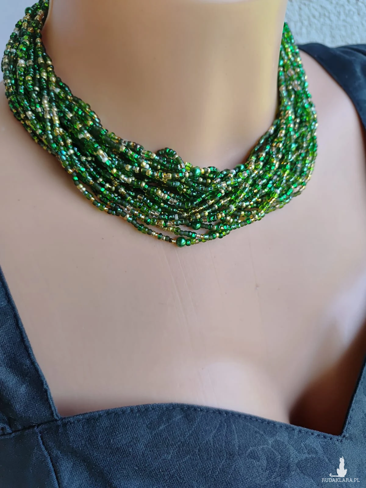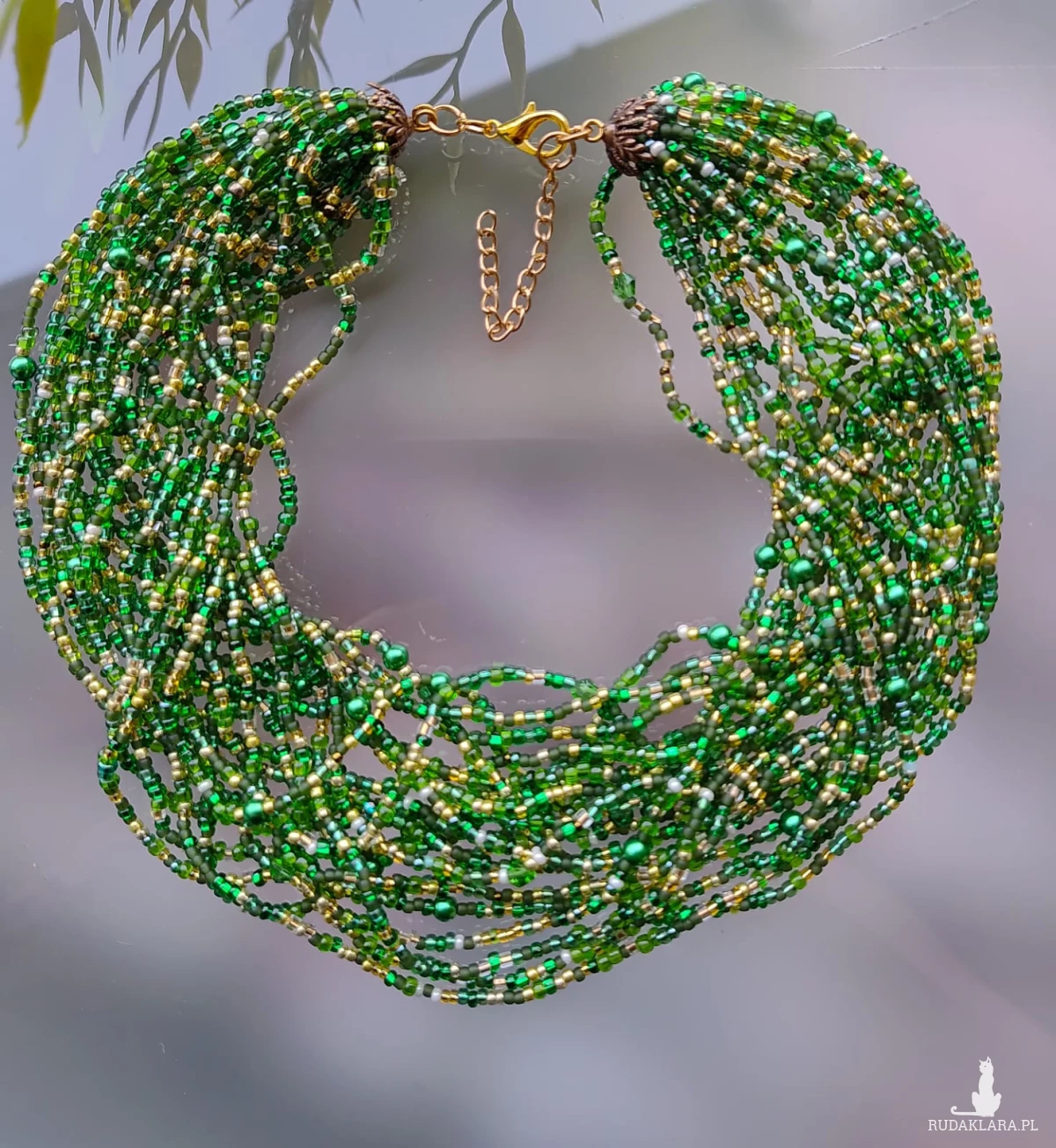 Naszyjnik z koralików szklanych w zielonym i złotym kolorze. Piękna