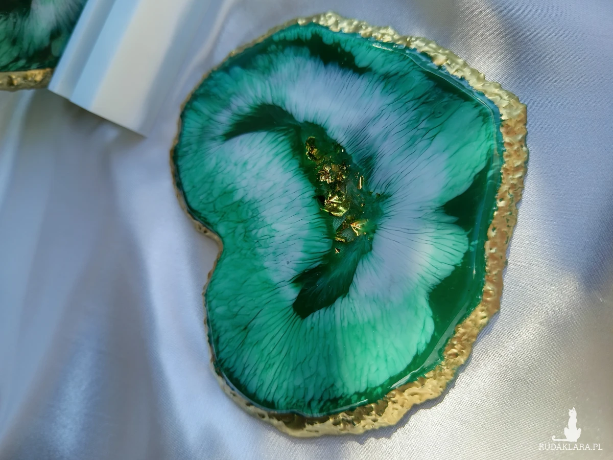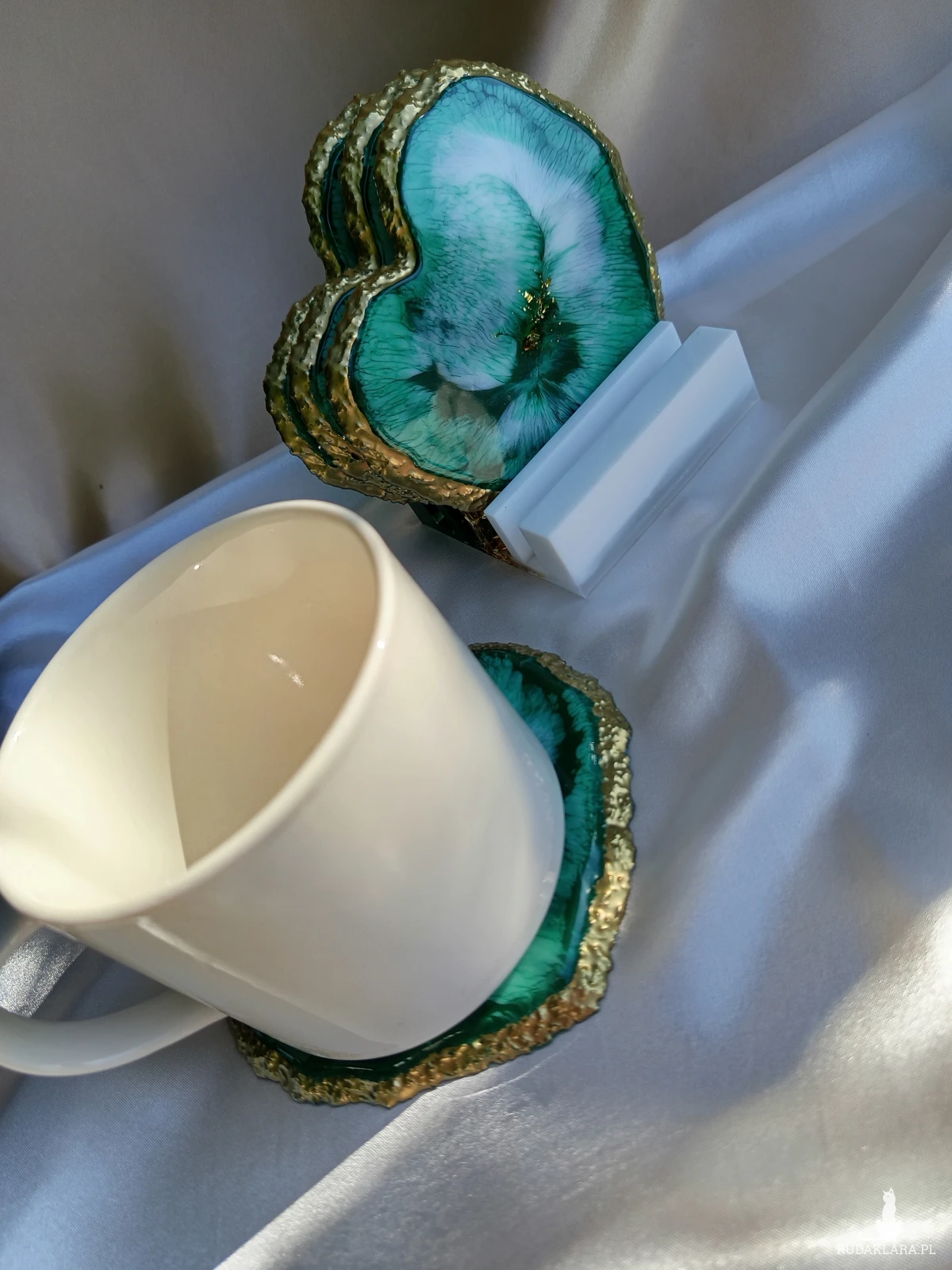 Zestaw z żywicy – Podstawki pod kubki w kształcie serca z zielenią, bielą i złotymi akcentami 💚