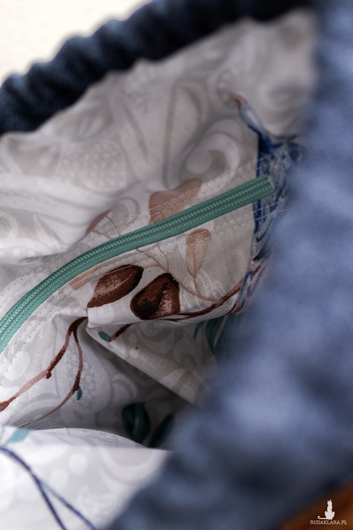 W środku plecak posiada kieszeń zapinaną na suwak. Wykończony jest bawełnianą podszewkę w kolorowe kwiaty.