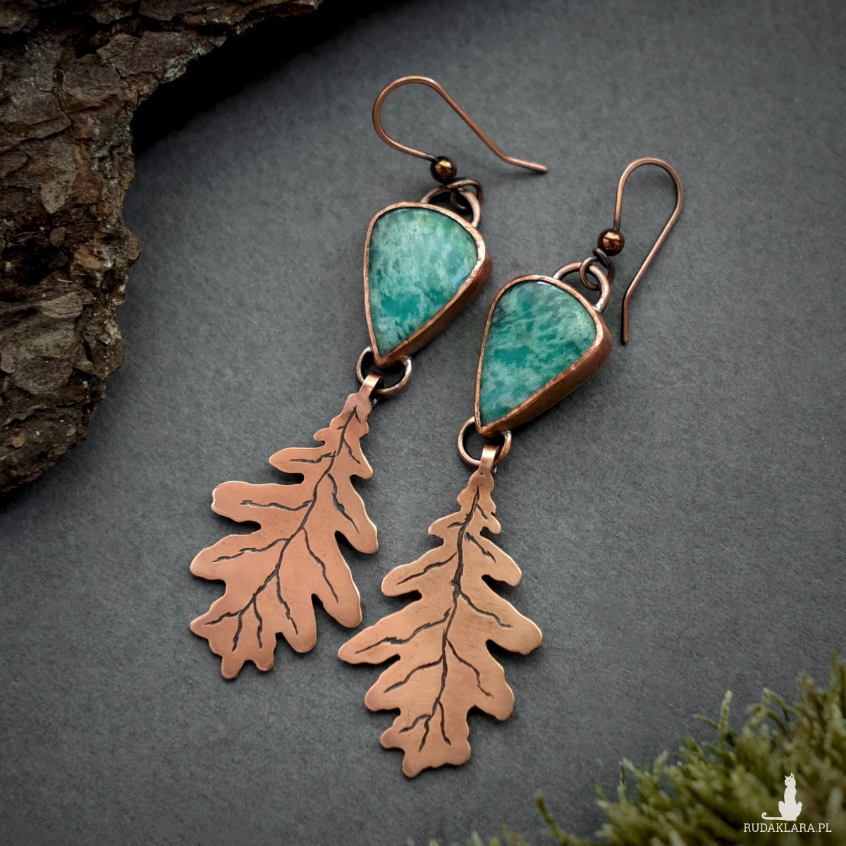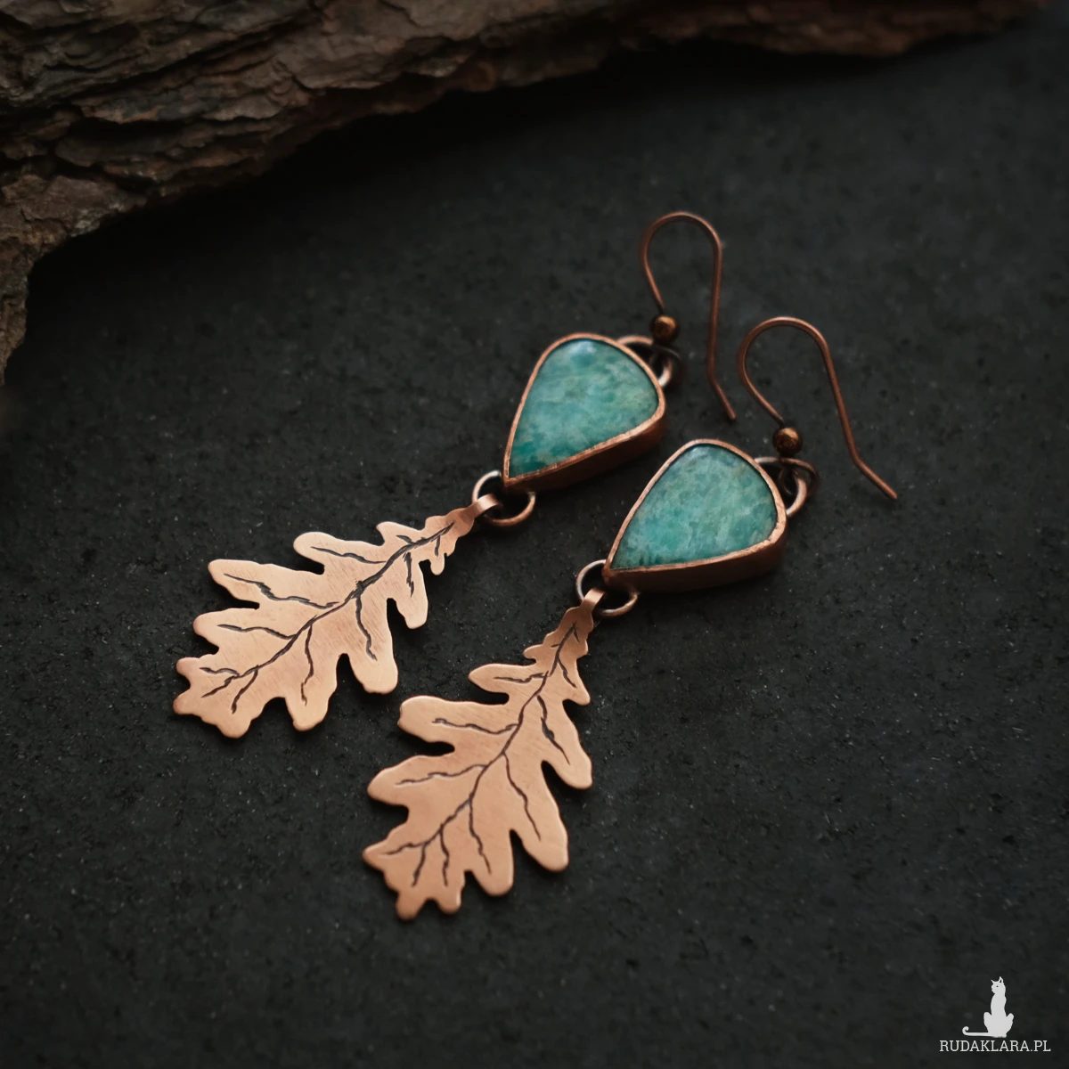 Miedziane unikatowe kolczyki z amazonitem. Długie i wyraziste, z ręcznie przygotowanymi i wyciętymi z blachy liśćmi dębu, sprawdzą się na co dzień jak i na większe okazje. Idealna propozycja dla fanki przyrody oraz biżuterii, która przyciąga uwagę :)