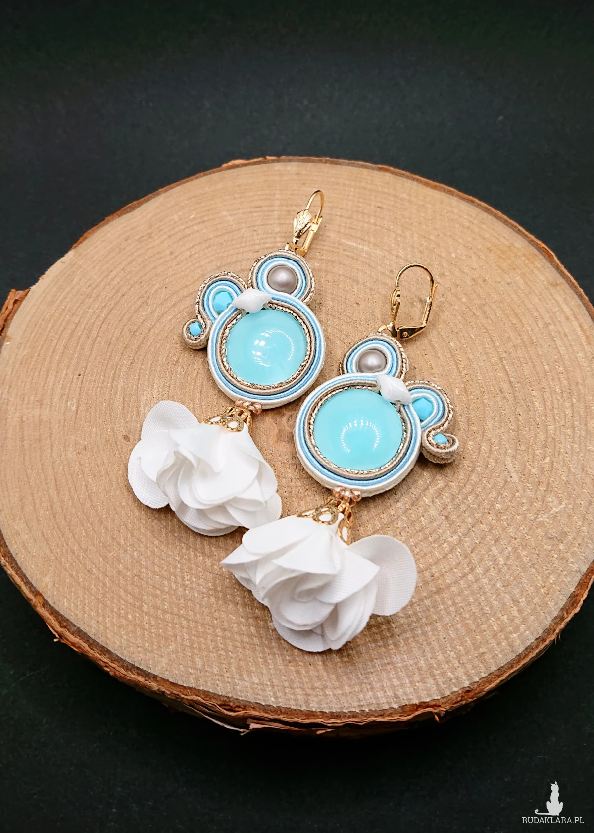Eleganckie kolczyki sutasz w stonowanej kolorystyce. Lekkie i wygodne w noszeniu. Mieniący się kaboszon oraz wiszące kwiatki nadają kolczykom unikatowy wygląd.