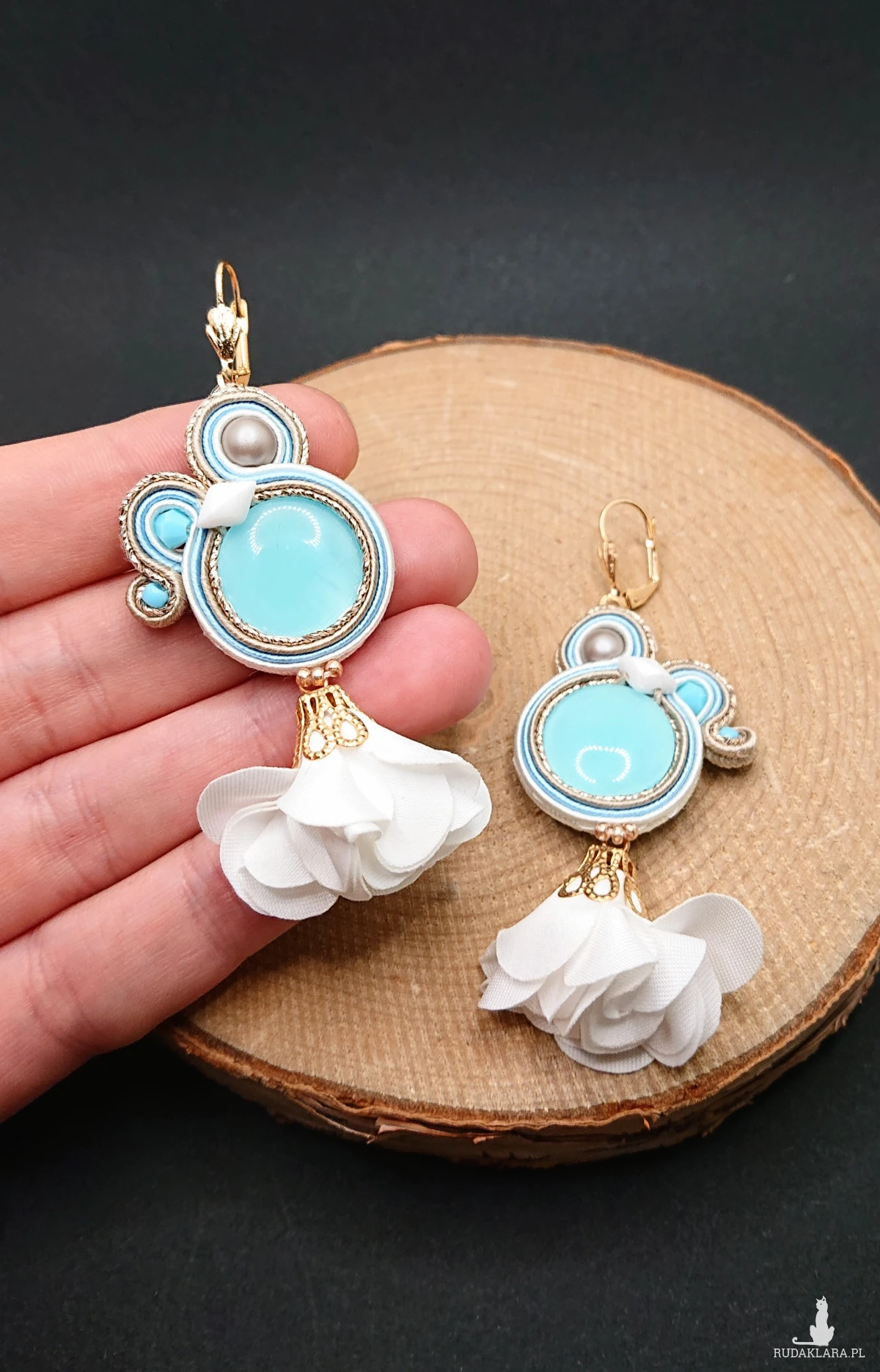 Duże błękitne kaboszony z kamienia kocie oko otoczone sznurkami sutasz oraz szklanymi koralikami o różnych kształtach i wielkościach. Błyszczący metalizowany sznurek nadaje kolczykom blasku i elegancji. Dół kolczyków zdobią materiałowe kwiaty w ozdobnych ażurowych czapeczkach. Kolczyki zawieszone na biglach angielskich w kolorze różowego złota.