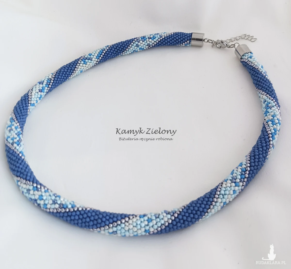 Naszyjnik w postaci grubszego sznura koralikowego. Został wykonany ze szklanych, japońskich koralików Toho i jest utrzymany w niebiesko-błękitnej kolorystyce.