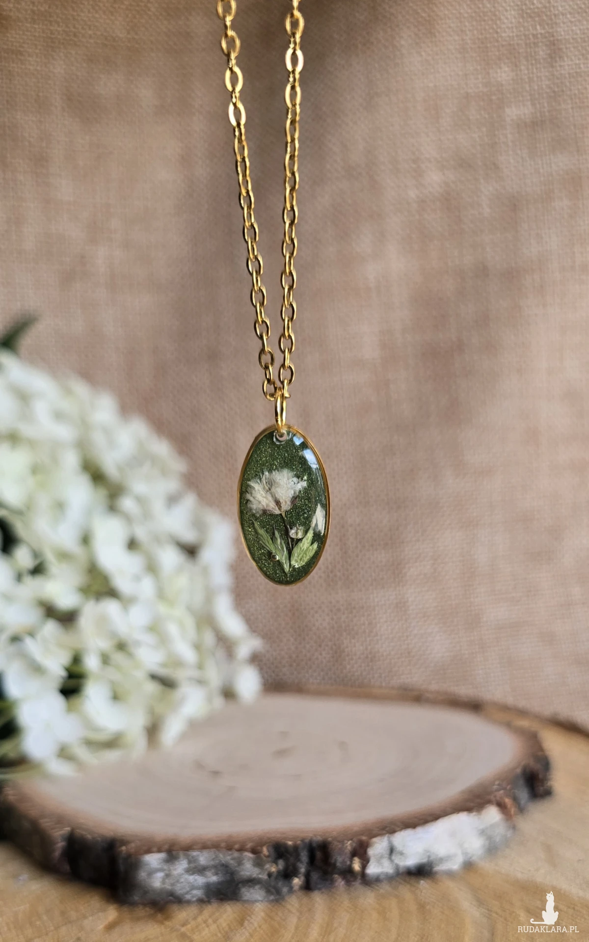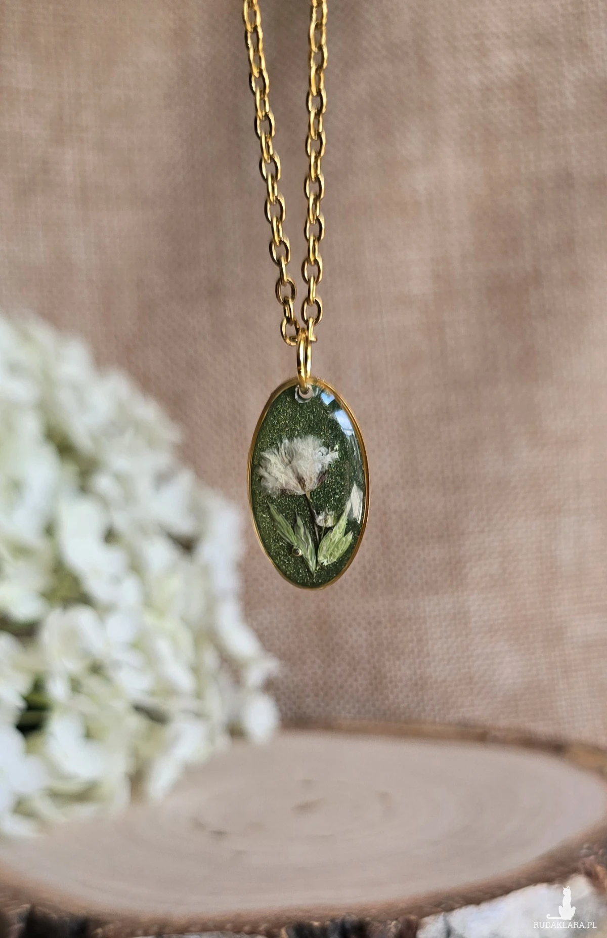 Oferuję Państwu unikalną biżuterię. Zawieszka jest wykonana z suszonych kwiatów i żywicy epoksydowej. Biżuteria jest wspaniałym i oryginalnym prezentem na lata.