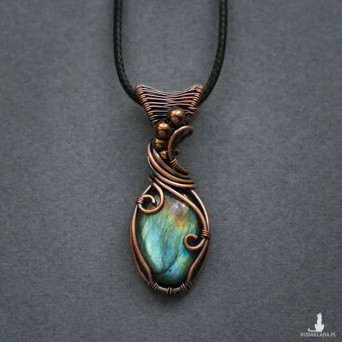 Drobny miedziany wisiorek mieści w sobie kamień labradorytu o pięknej błękitno-zielono-pomarańczowej iryzacji. Posiada szeroki uchwyt ozdobiony koralikami hematytu oraz fantazyjne sploty miedzianego drutu. Świetnie dopełni stylizację kobiety stawiającej na drobną, ale pełną uroku biżuterię.