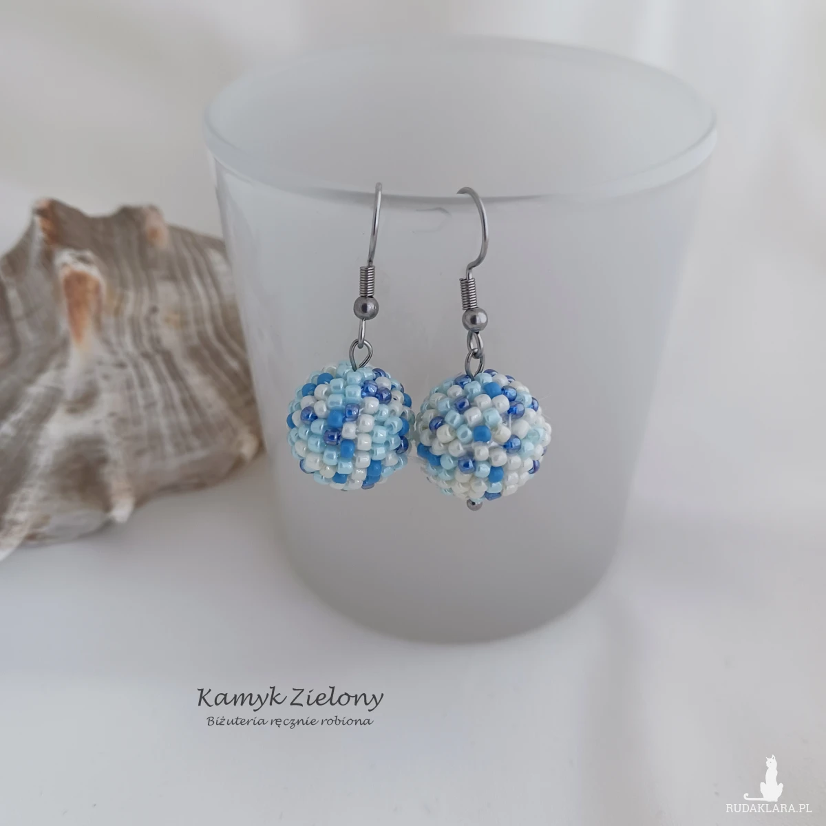 Kolczyki do kompletu zrobiono z koralików tego samego rodzaju co bransoletka. Mają formę kuleczek i zawieszono je na biglach otwartych ze stali chirurgicznej.