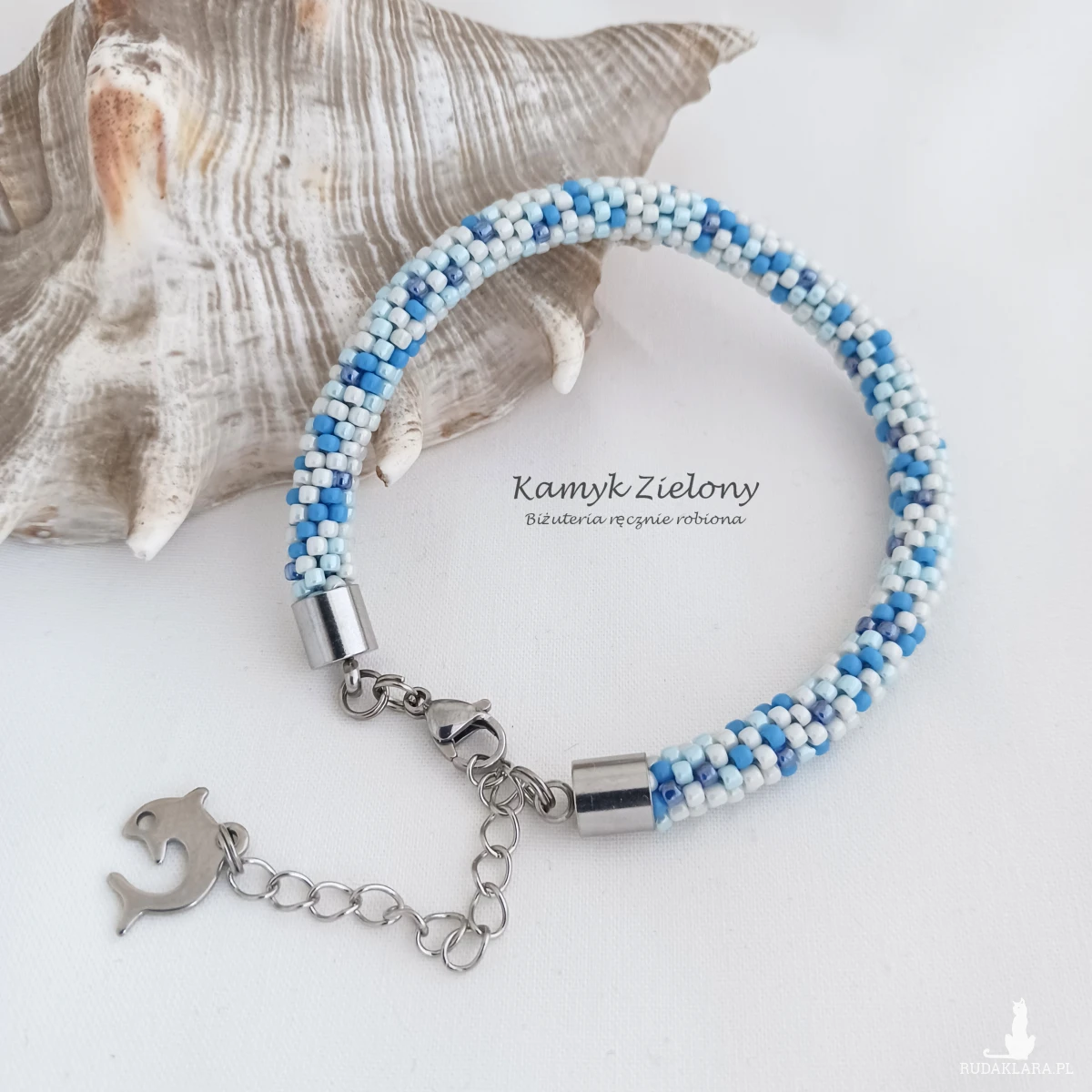 Bransoletka ma formę cienkiego melanżowego sznura koralikowego i została wykończona elementami ze stali chirurgicznej. Na końcu łańcuszka przedłużającego dopięta została przywieszka w kształcie delfinka.