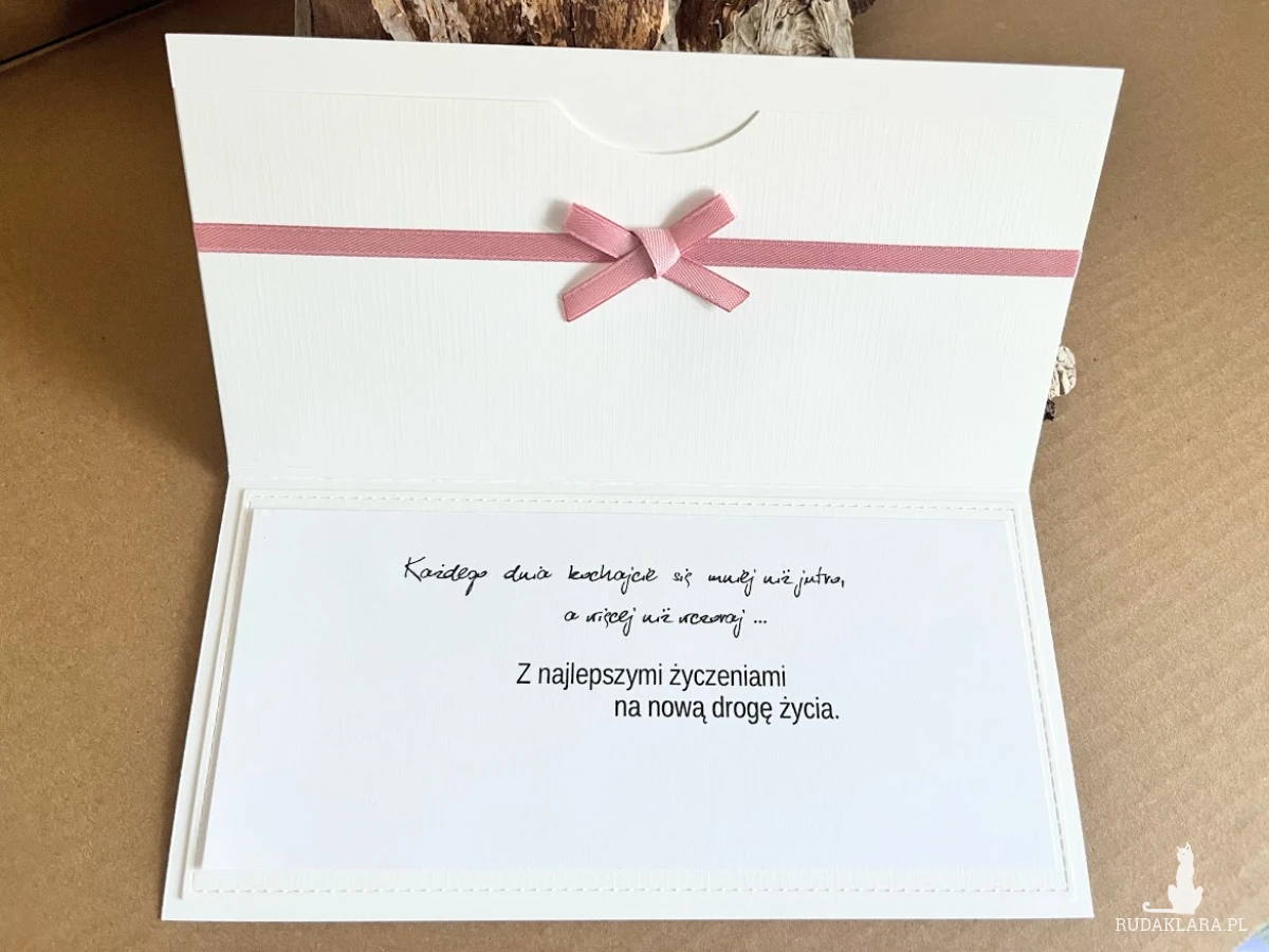 Wyjątkowa i elegancka kartka okolicznościowa w bieli,wykonana z najwyższej jakości materiałów do scrapbookingu . Zdobiona elementami 3D. Wykonana z dbałością o każdy detal. Wewnątrz kartki znajduje się kieszonka na małe co nieco lub kupon lotto oraz gotowe życzenia do własnoręcznego podpisu. Wielkość kartki 10,5x21 w komplecie z kopertą