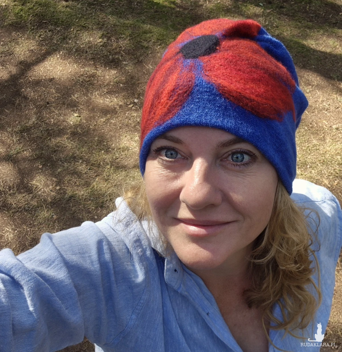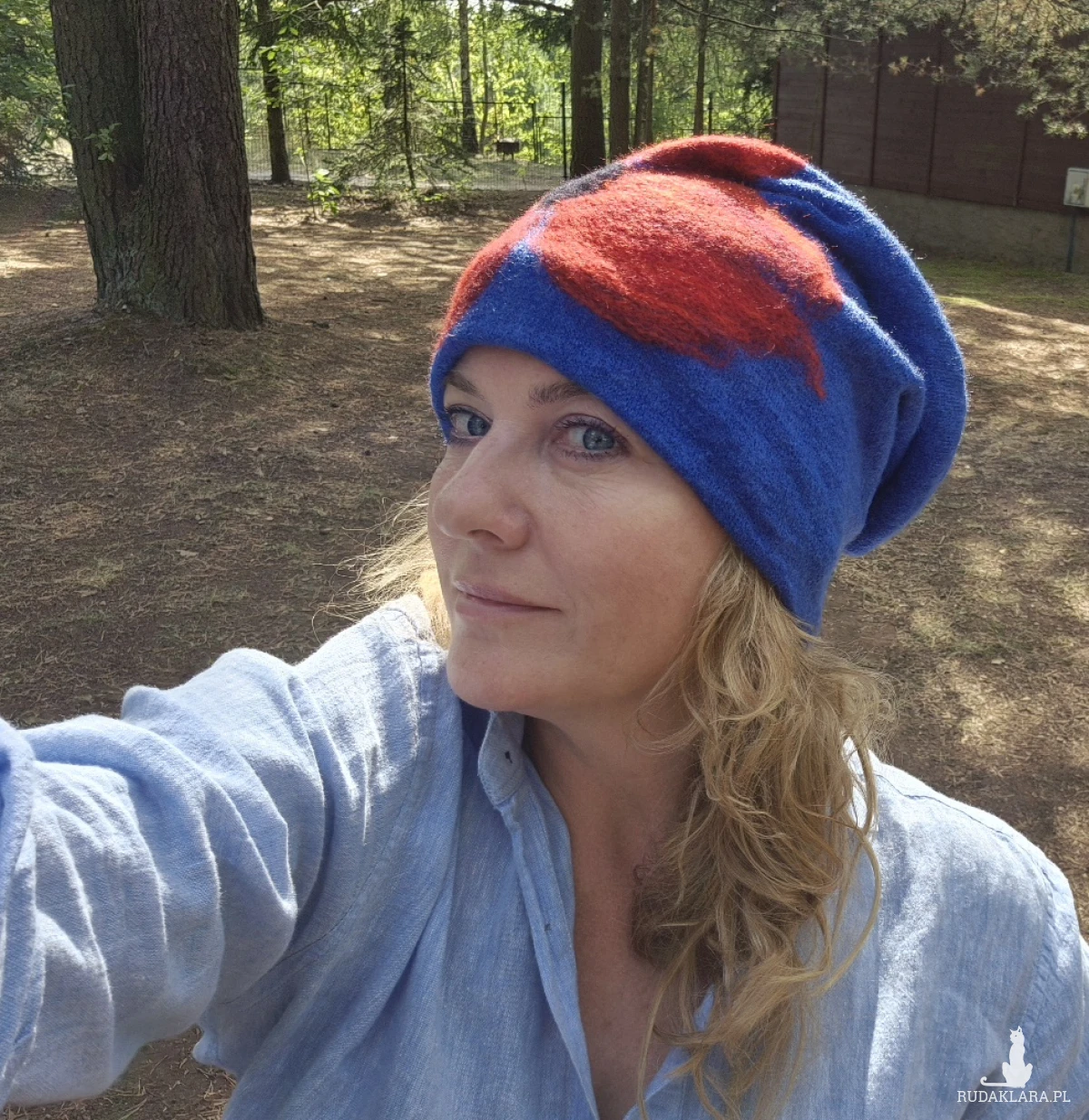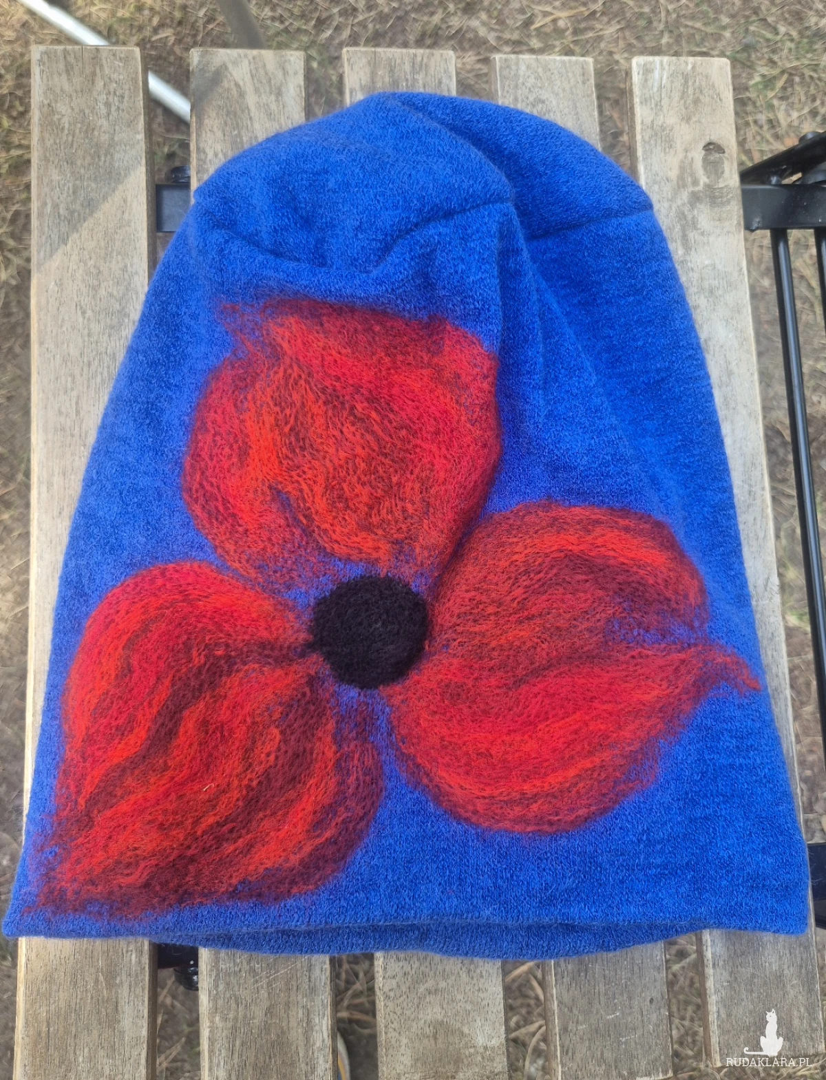 czapka wełniana filcowana zimowa niebieska ostatnia, handmade w kwiaty na podszewce-- rozmiar uniwersalny, wełniana, filcowana wełną merynosów, bardzo ciepła, fantastyczna, miła, miękko układa się na głowie, niesamowicie zwraca uwagę, doskonałą na codzienne noszenie jak i na prezent, zawsze możesz ją założyć po basenie i przeżyjesz,box a1