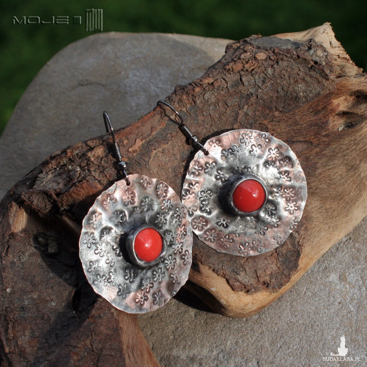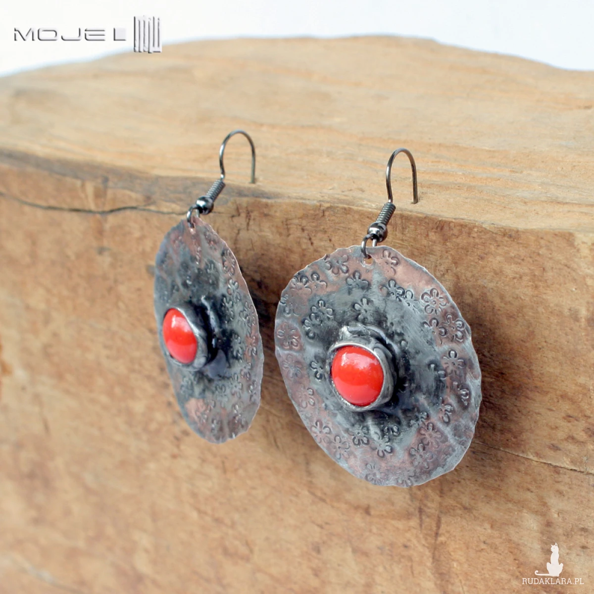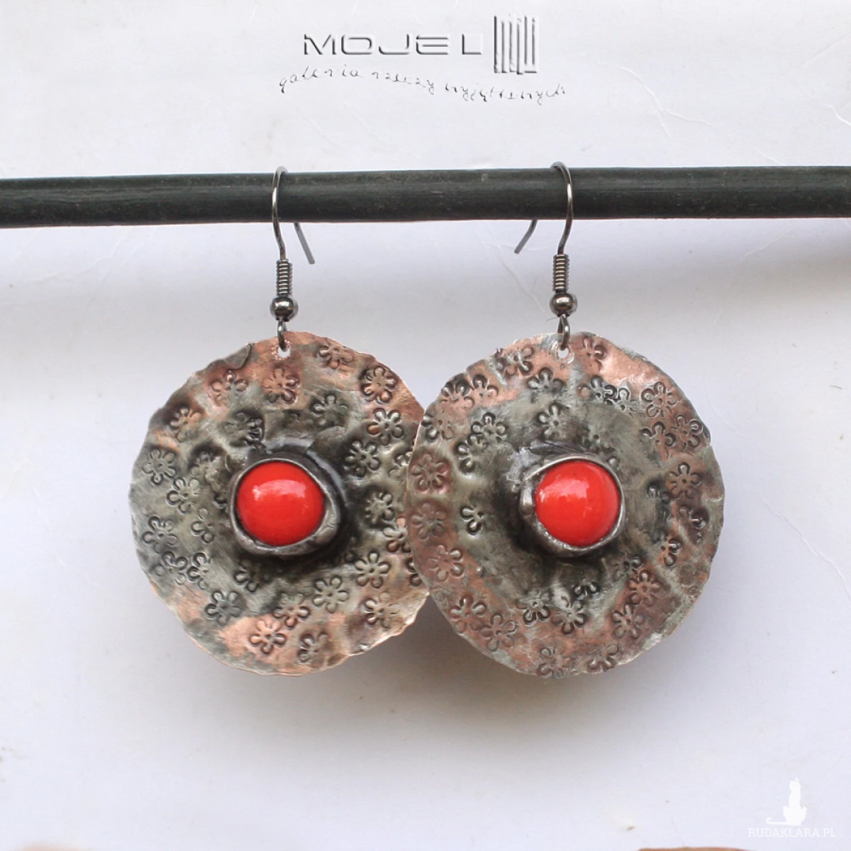 Miedziane okrągłe kolczyki ze szklanym okiem w cynobrowym kolorze. Blaszka jest ozdobiona małymi kwiatuszkami - młotkowana, pokryta cyną, patynowana i przecierana dla wydobycia wzoru. Blaszka jest cienka, a kolczyki dzięki temu lekkie. Metalowe bigle.